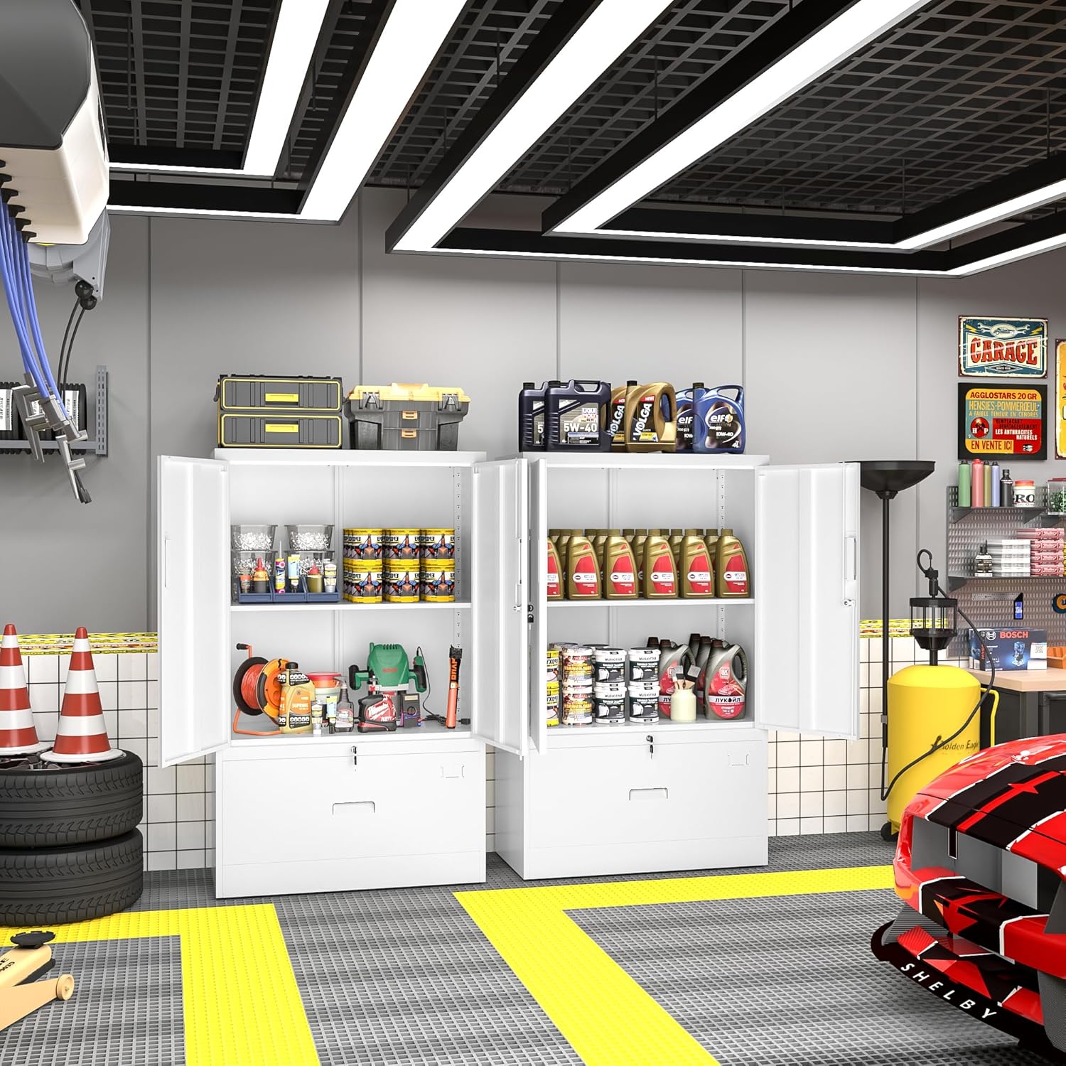 • [Excellent Materials]:Greenvelly metal storage cabinet with drawer made of cold rolled steel with steel plate thickness of 0.8mm.Each shelf could hold up to 180lbs.The surface of the steel plate uses an advanced painting process to prevent corrosion and rust, making it suit for wet or high temperature environment and easy to clean.
