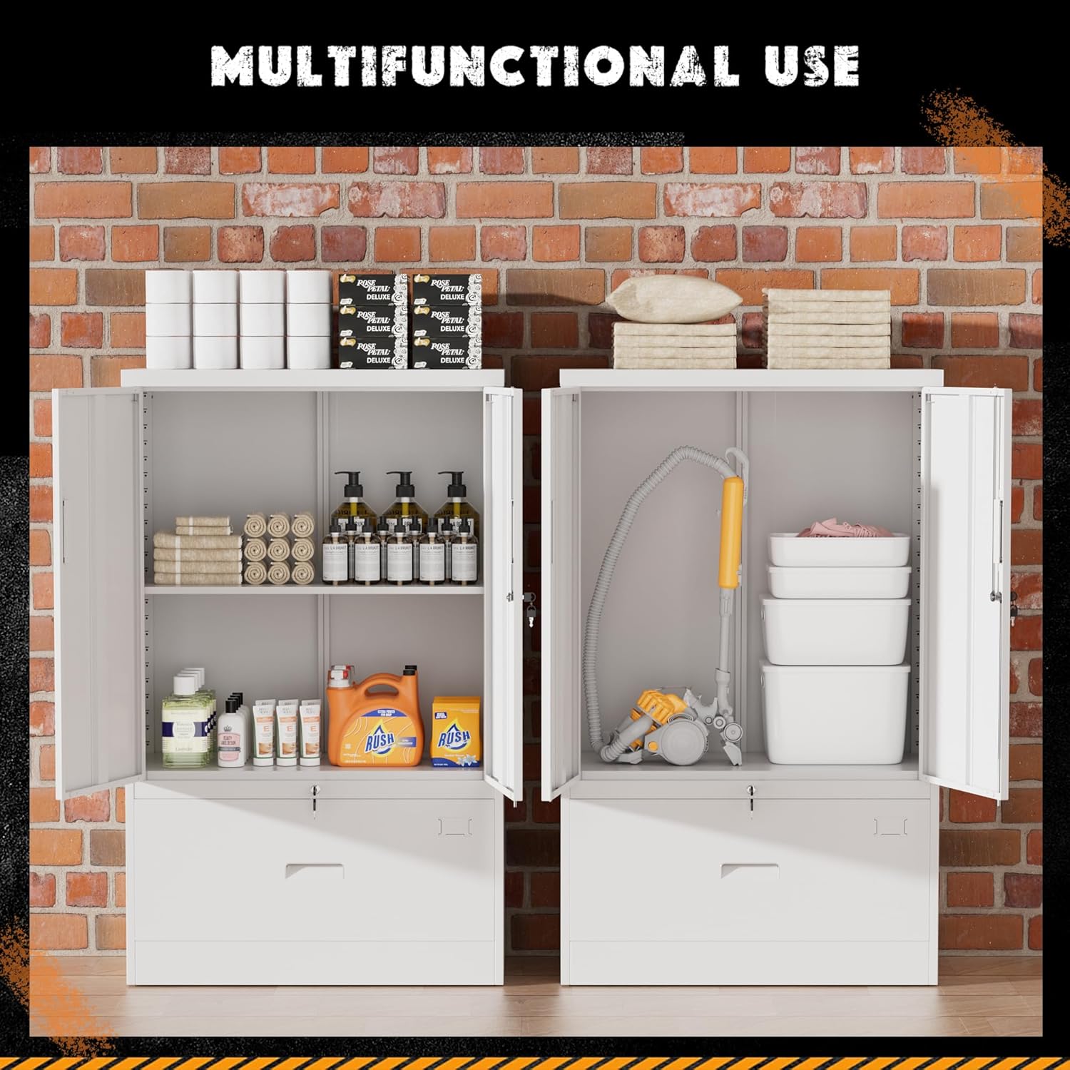 • [Middle Size&Large Storage]:Greenvelly metal file cabinet with lockable doors and shelves have a compact size (52”H*32”W*16”D),and each one has a adjustable shelves inside, which can be adjusted according to the height and size of the storage goods.The bottom drawer is suitable for storing various documents,we have also set up hanging rod ,which will bring you convenience in storage files.
