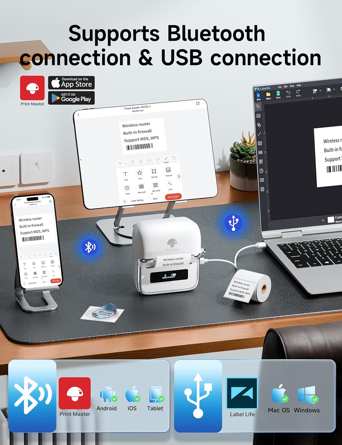 • Highly Compatible: Phomemo M250 mini sticker maker is compatible with multiple systems including Android, iOS, iPad & macOS, and Windows 7 or above. Connect your smartphone or iPad via Bluetooth using the "Print Master" app. For computer connection, simply download the driver and "Labelife" app, then connect using USB (refer to the software installation tutorial on the page for detailed instructions)