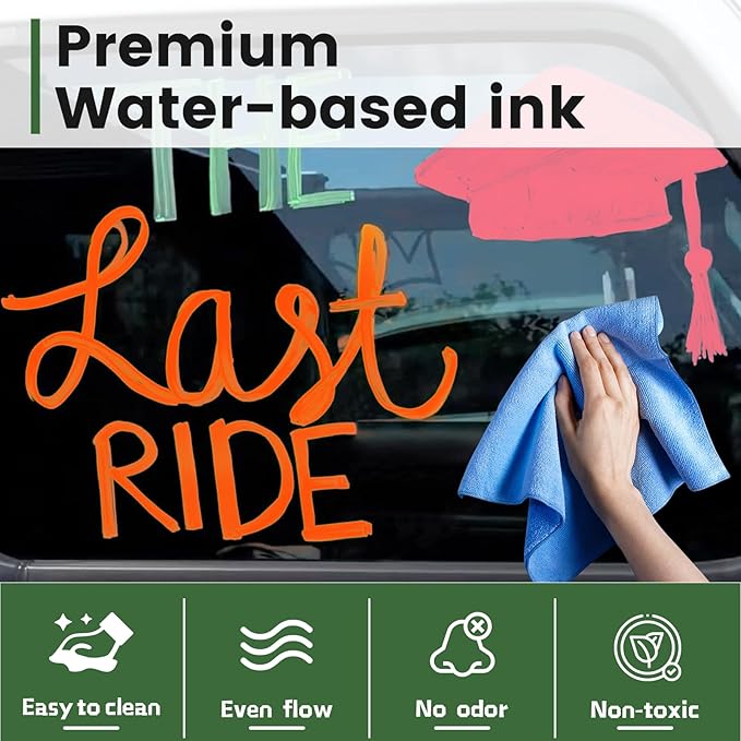 • EASY TO USE & CLEAN: Our liquid chalk markers erasable are designed for effortless application and clean-up. To use, simply put the cap back on, shake the marker thoroughly, press the tip to saturate it with ink, and test it on paper. Erasing is equally straightforward, as our dry & wet erase markers wipe clean with a dry or damp cloth, leaving no residue.