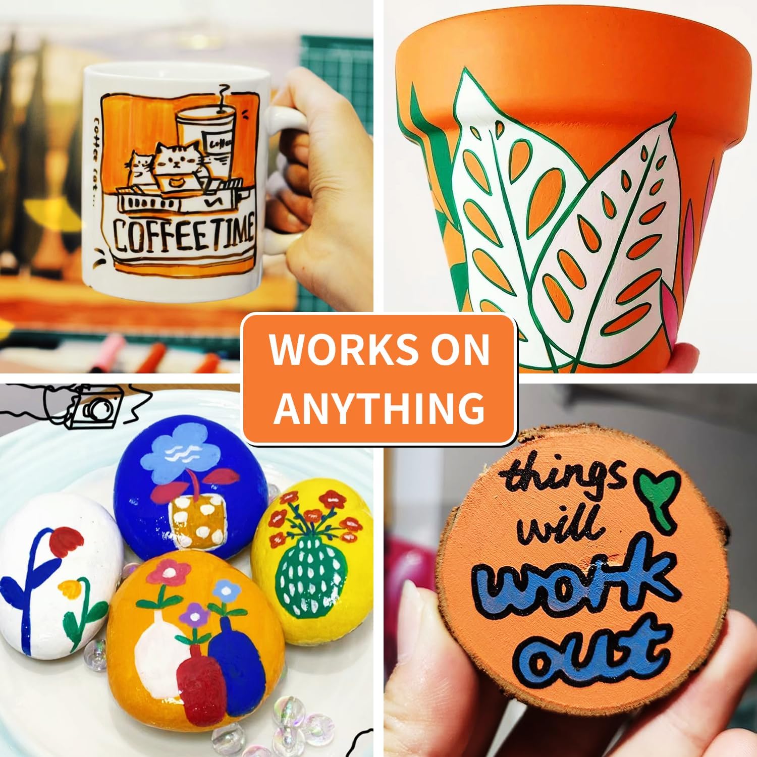 • Extensive Use: Paint pens mark steel and mark objects such as tires, bolts, metal pipes, bumper panels and more. Not just metal, orange permanent markers can be used on rocks,wood, ceramic, canvas, tires, rubber, glass and plastic surfaces
