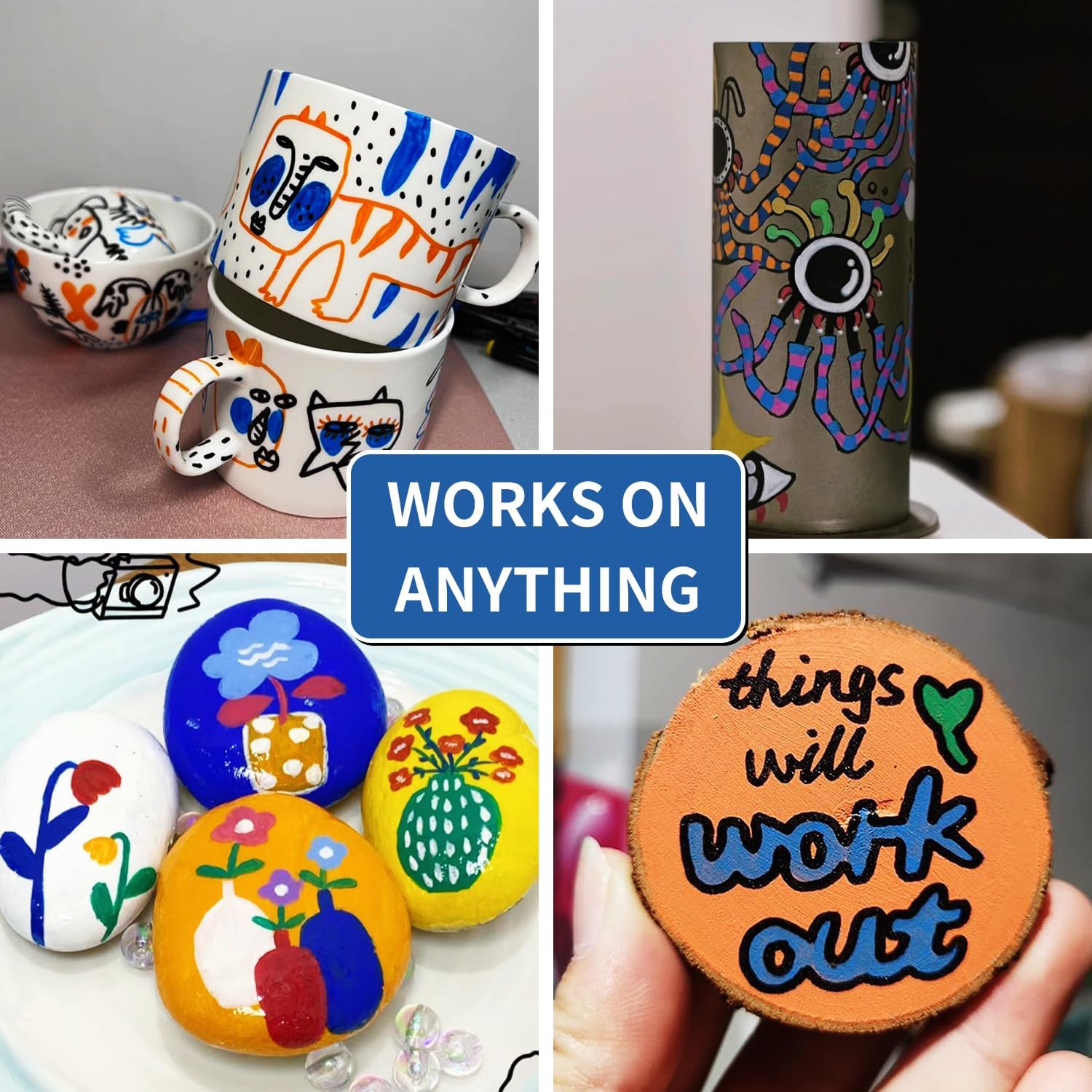 • Extensive Use: Paint pens mark steel and mark objects such as tires, bolts, metal pipes, bumper panels and more. Not just metal, Blue permanent markers can be used on rocks,wood, ceramic, canvas, tires, rubber, glass and plastic surfaces