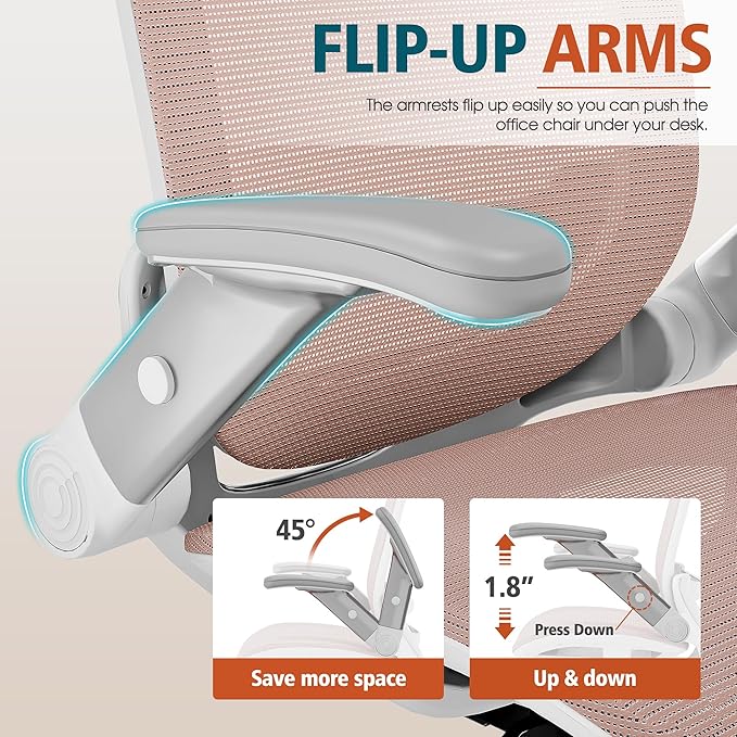 • 【ADJUSTABLE FLIP-UP ARMS】-If you want to make the most of the space under the table or choose a home desk chair for a small space/bedroom, this is the office chair for you! The GABRYLLY ergonomic office mesh chairs' armrest can be folded up(45°) and be adjusted the arms' height(1.8'').