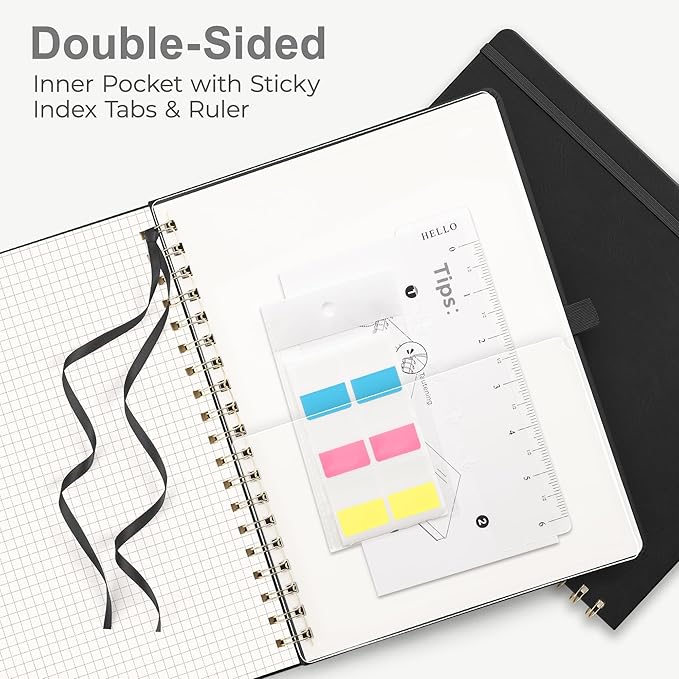 • GRAPH PAPER NOTEBOOK: RETTACY Graph Notebook comes in a A4 (8.5'' × 11'') size, 110 Pages, Leather Hardcover, Sturdy Twin-wire Spiral Bound, 5 mm grid writing space, 100 GSM Paper, Pen Holder, Elastic Closure Bands, Inner Pocket, Ribbon Bookmark, Lightweight Ruler, Sticky Index Tabs
