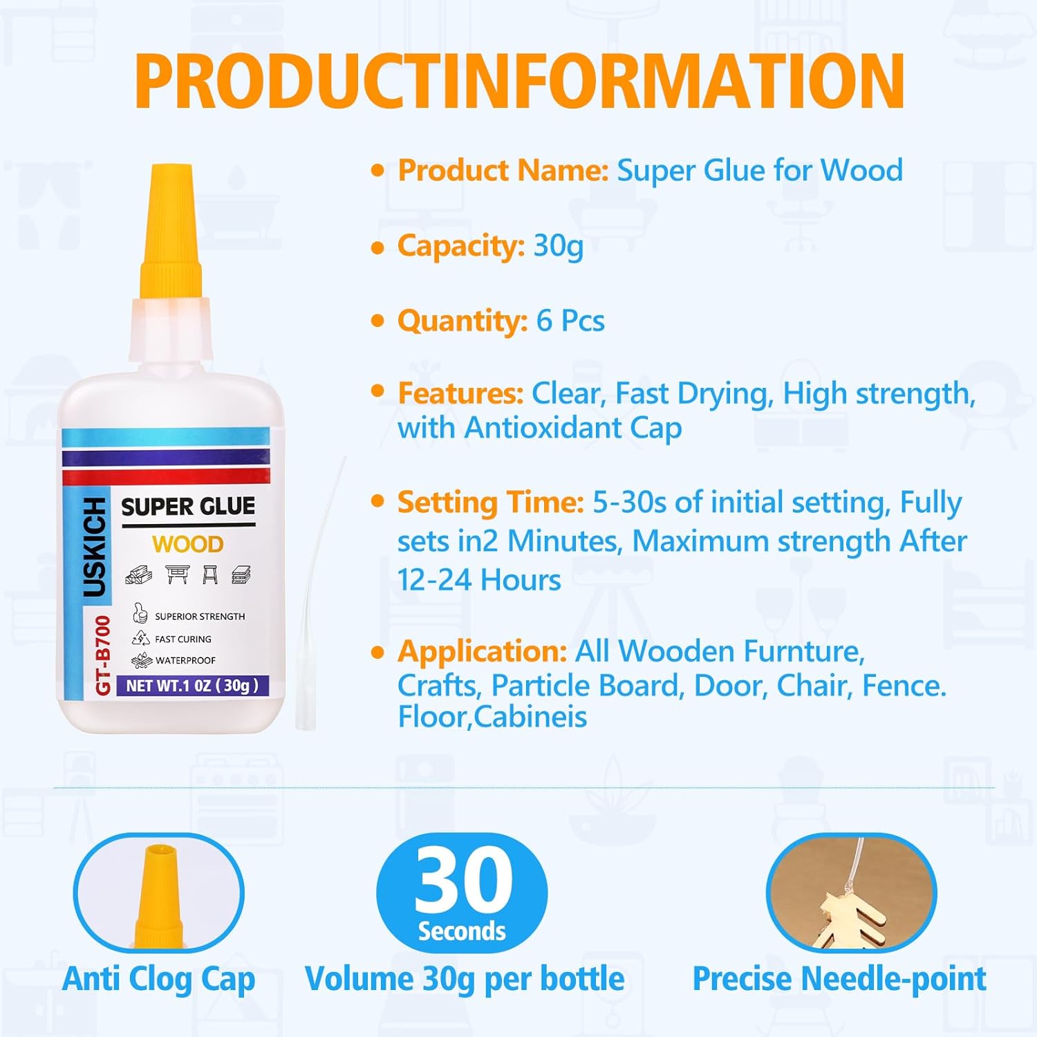 • ⭐Great Value Package: When you purchase USKICH Super Glue, You will receive 6 x 1 fl oz of Super CA Glue, 6 extra applicator cap to prevent future clogging