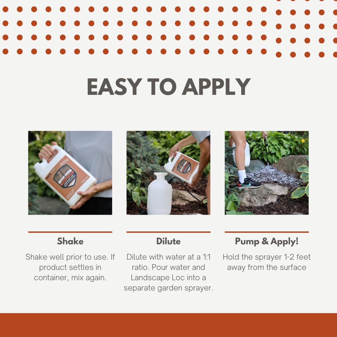 • MAKES 2 GALLONS: Mix 1 part water with 1 part Concentrate in a separate container (1:1 ratio). 1 gallon of concentrate makes 2 gallons of ready-to-use Landscape Loc.! After dilution, shake well before pouring into a garden sprayer (sold separately) and spraying.