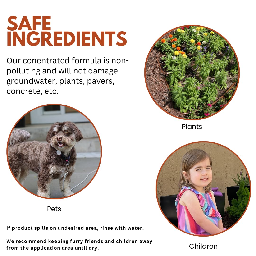 • SAFE TO USE: Non-toxic. Safe for areas inhabited by pets, plants, and children. Will not damage outdoor landscaping, groundwater, pavers, concrete, asphalt, or clothing. Have a spill? Rinse the area with water.
