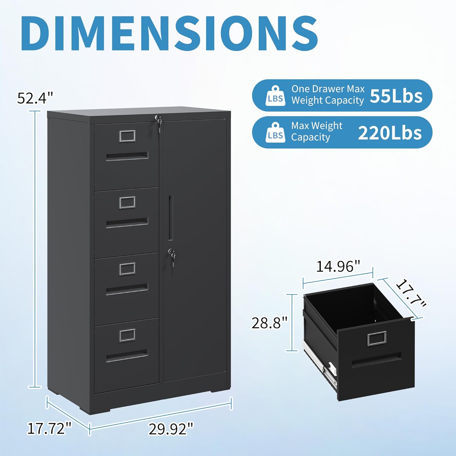 • 【Sturdy and Long-lasting Construction】The 4 drawer locking file cabinet is made of high-quality cold-rolled steel, ensuring it's strong and long-lasting. Each drawer can hold up to 55lbs, you can sit a printer on the top of the metal cabinet without worry, making it perfect for busy offices.
