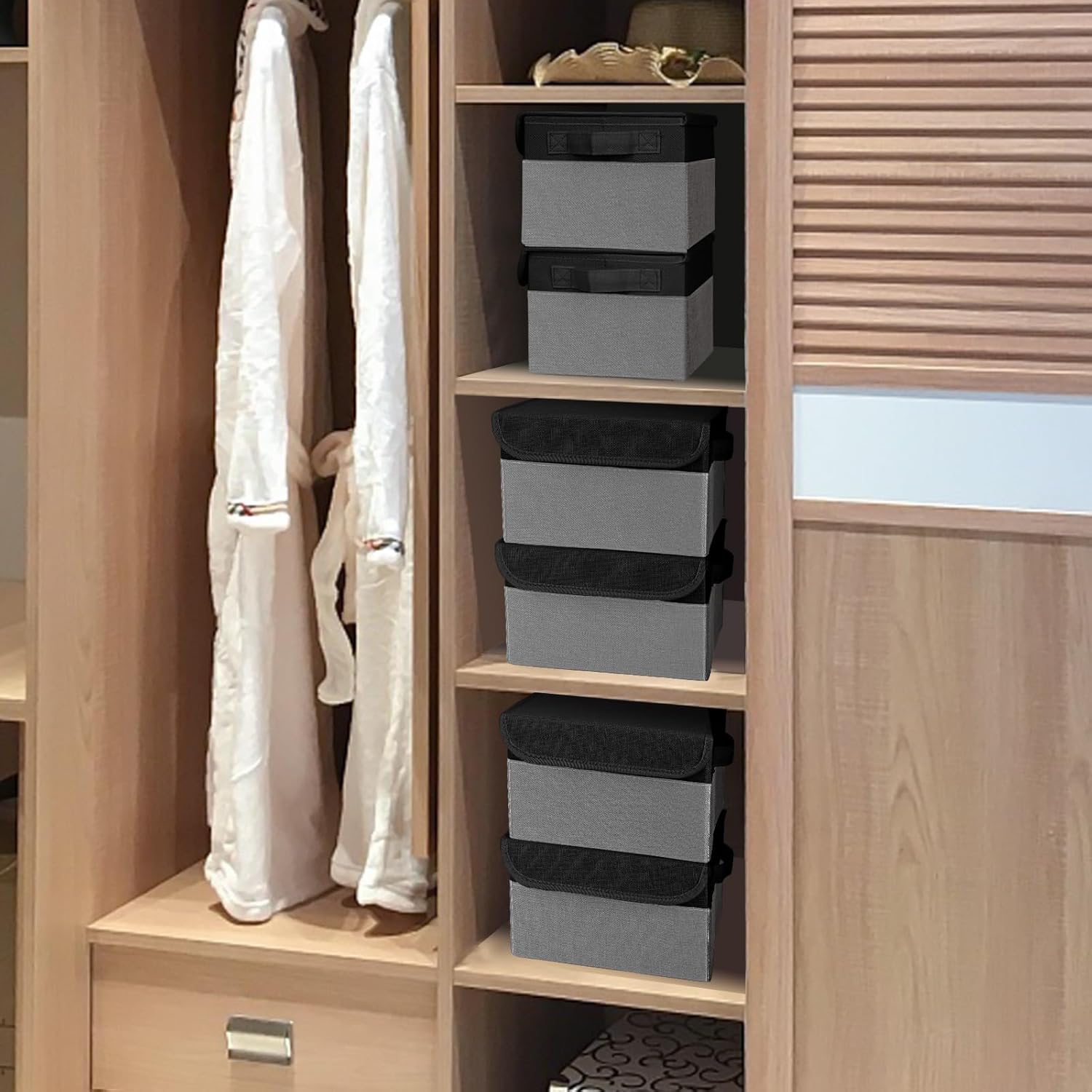 Small 8 Quart Linen Fabric Foldable Storage Bin Cube Organizer Basket with Lid & Handles, Collapsible Decorative Box Container for Home, Dorm, Closet, Black & Gray, 10"x8"x6", 6-Pack