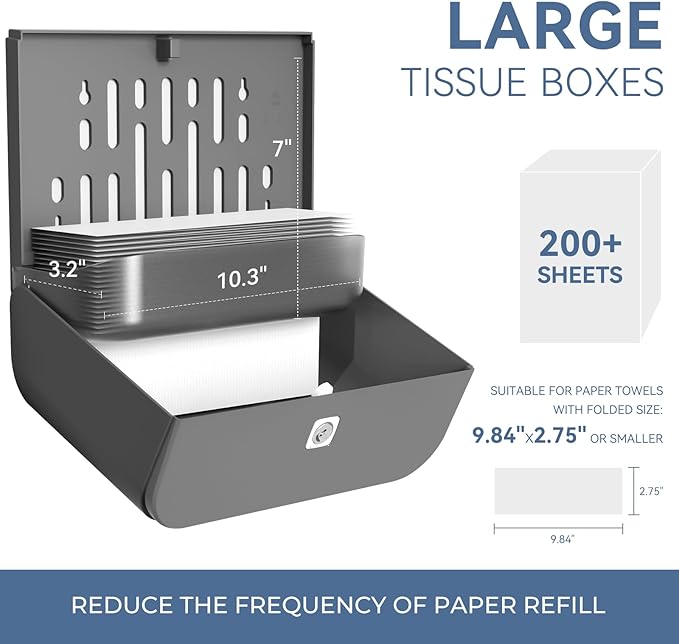 • 【Dimension】 Product Size: 10.7"L x 3.7"W x 8"H". Suitable towels size : C-Fold Multi-fold trifold paper towels with folded size within 10.2" L x 3.1"W.