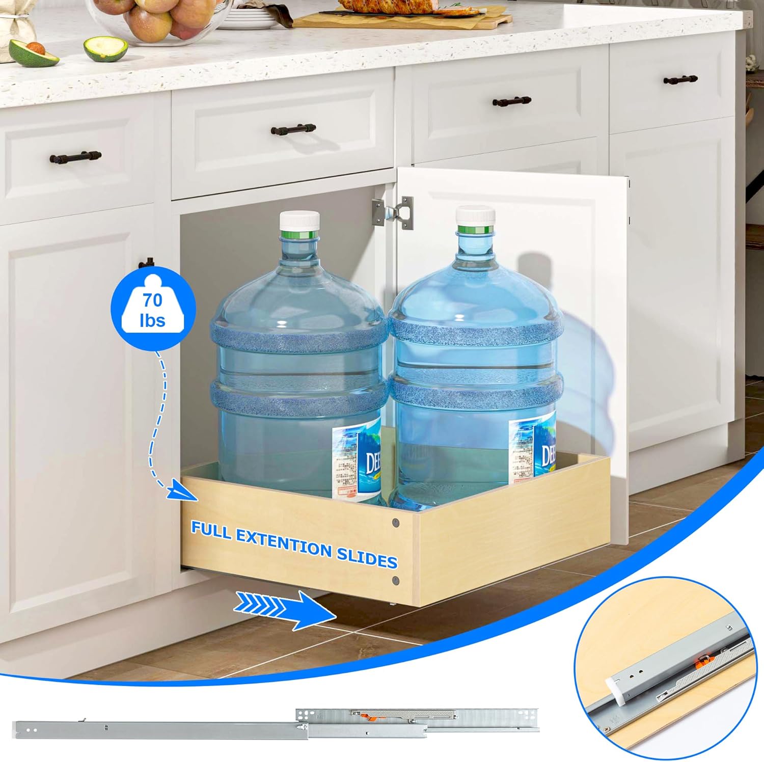 • 【Heavy Duty Soft Close Slides】 The slide out cabinet organizer is made of premium soft-close slides, full extension. It can hold up to 70 pounds of weight, making the cabinet drawer suitable for heavy pots and pans etc.
