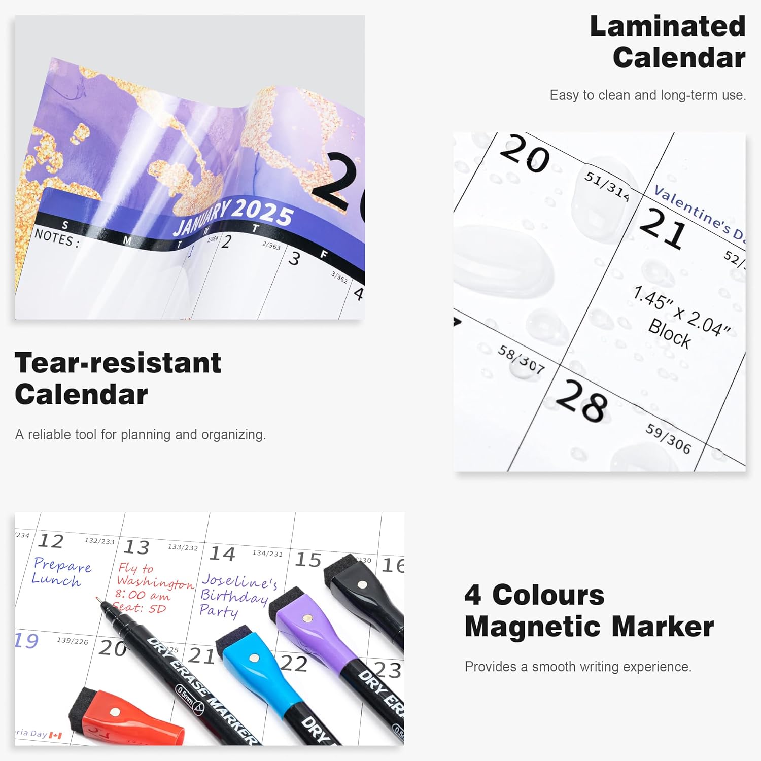 • ✨ Dry Erase Wall Calendar : is made of PET Film and 300 grams Copperplate Paper, providing a durable surface that resists scratches and smudges, while the sturdy Copperplate Paper backing keeps it in place without curling.