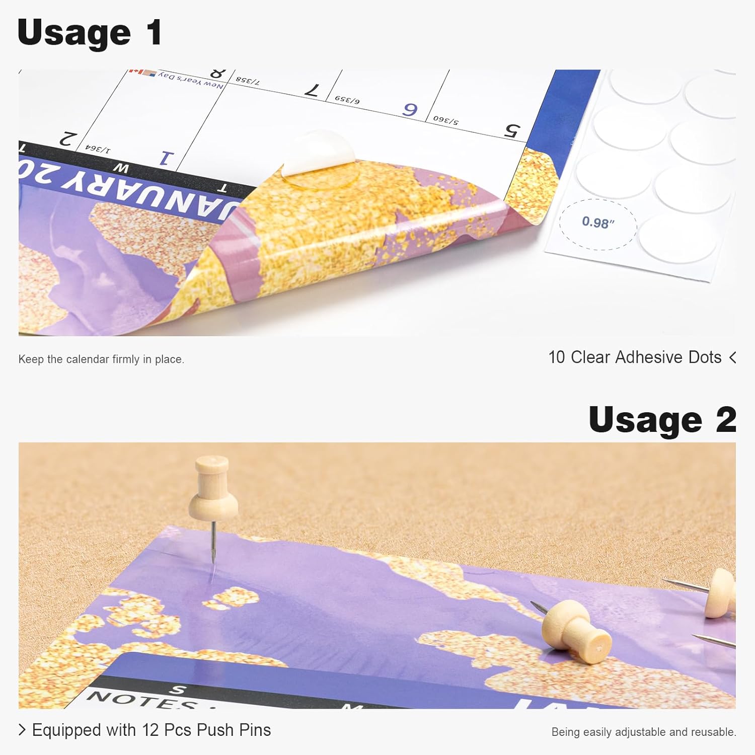 • ✨ Laminated Calendar with Dates: Waterproof wall calendar comes with a mini eraser, four dry-erase markers, 12 push pins, and 10 transparent round stickers. 2 yearly calendar planner covers the time range from Jan 2025 to Dec 2026, making it perfect for long-term use.