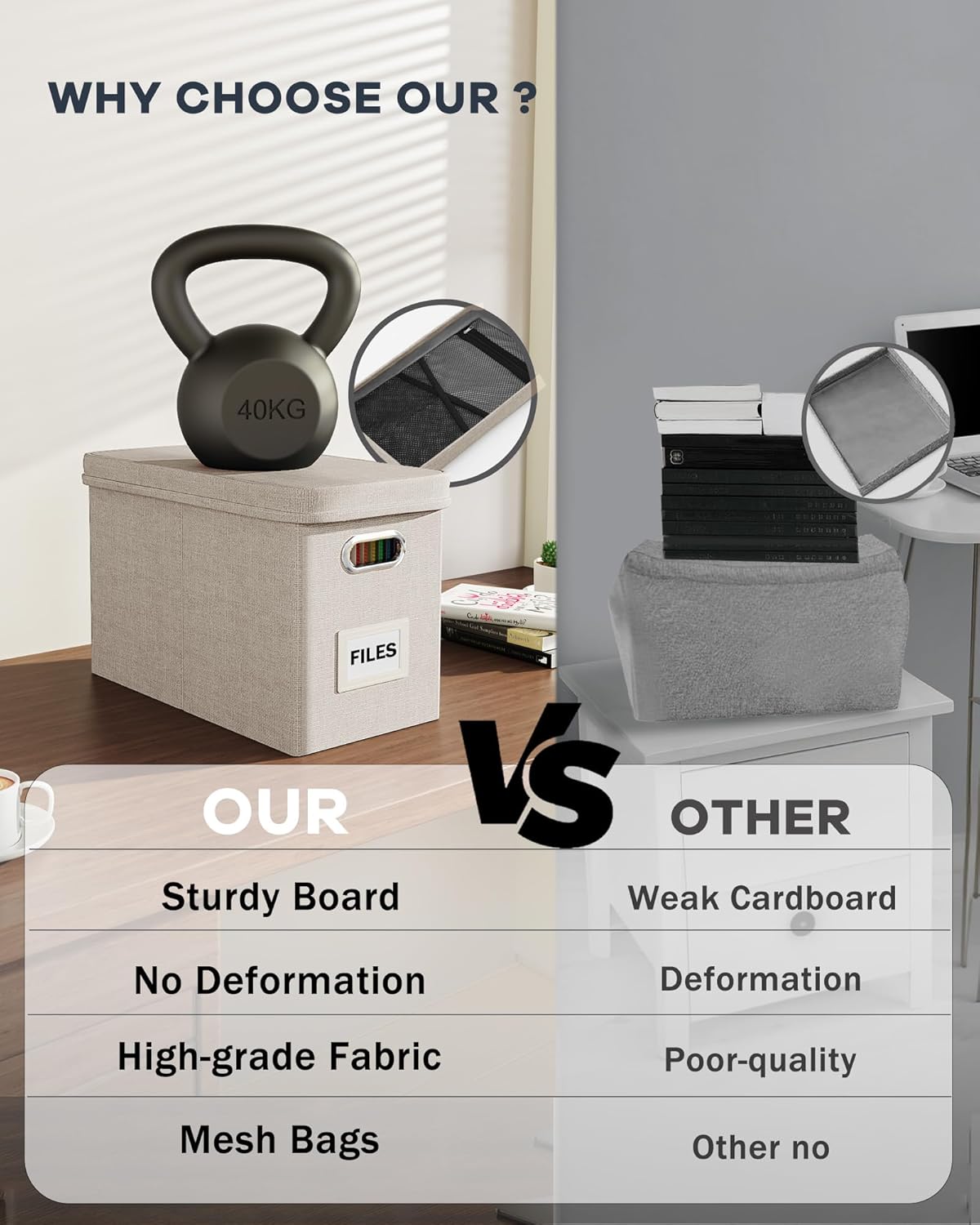 • 【Sturdy & Stackable】Portable storage box is made of well-made linen fabrics and durable material, with good support and bearing capacity, and the box top can withstand 100 lbs. The document boxes can be stacked when in use, or folded for easier storage when not in use.