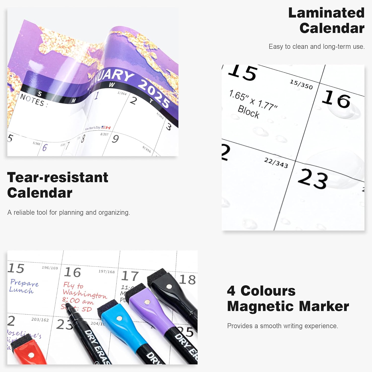 • ✨ Dry Erase Wall Calendar : is made of PET Film and 300 grams Copperplate Paper, providing a durable surface that resists scratches and smudges, while the sturdy Copperplate Paper backing keeps it in place without curling.