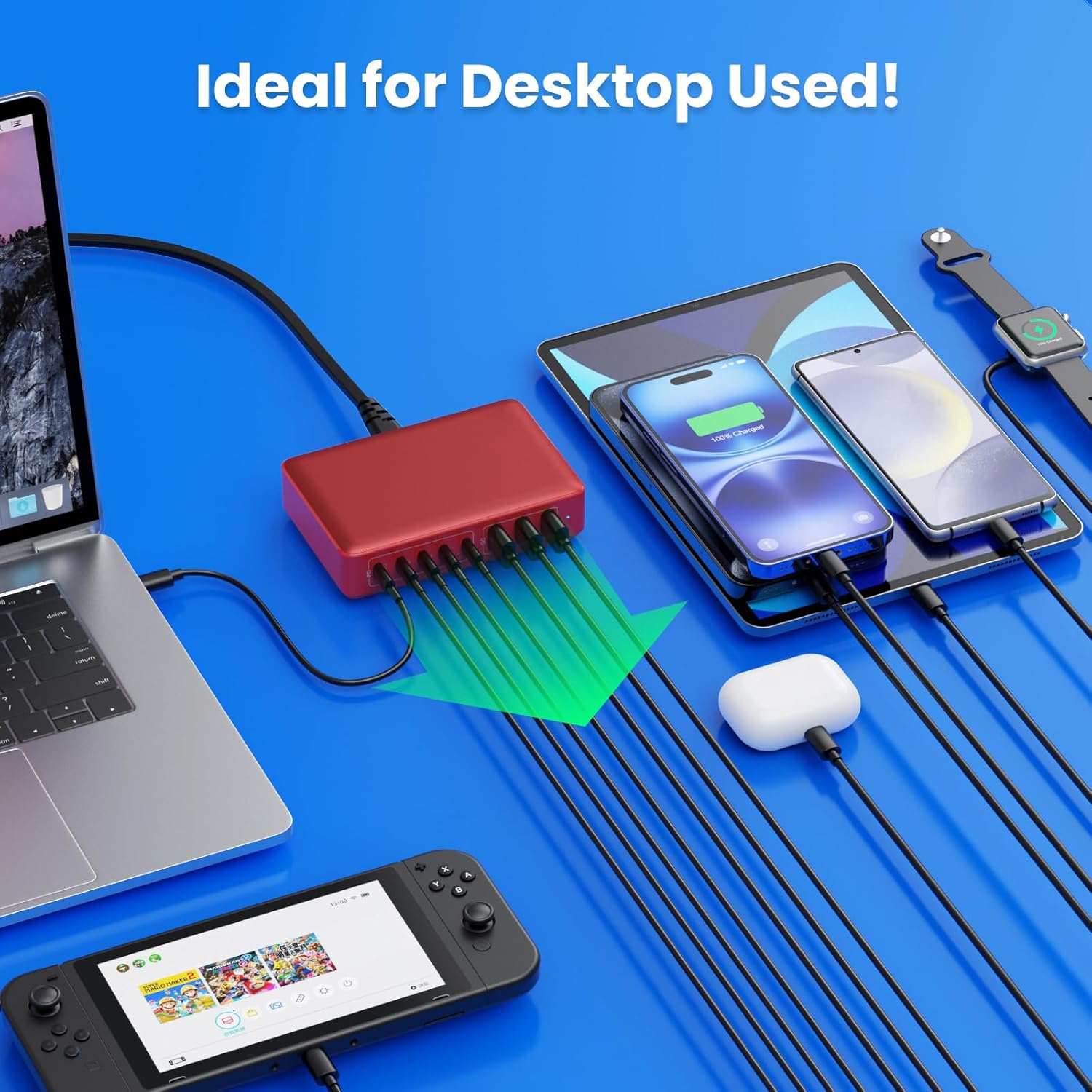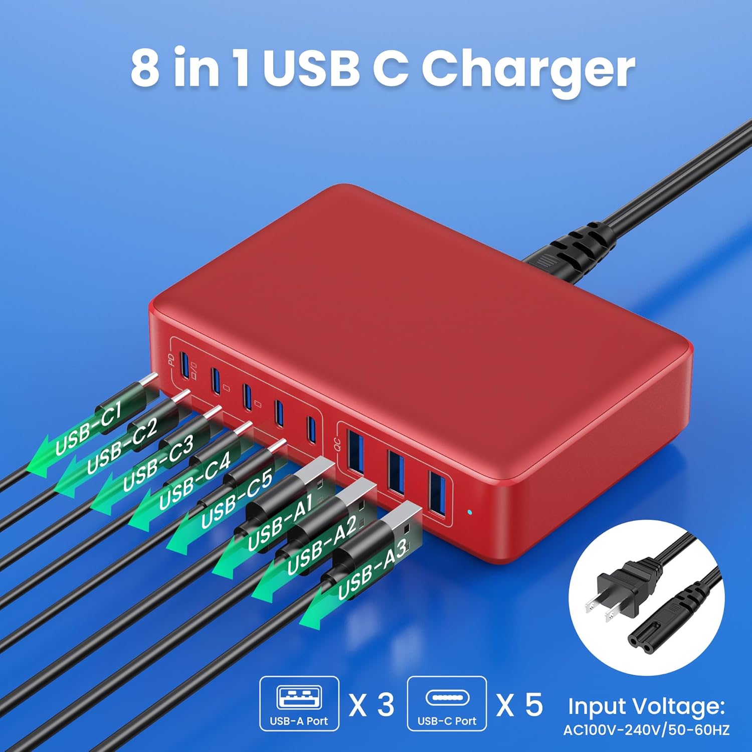 • 【300W Super Fast 8-in-1 Usb C Charger Block】Our USB charger provides multi charging options to meet your different needs. With 5*USB C ports and 3*USB A ports, no need for more adapters, you can use just one outlet to plug in laptops, tablets, smartphones, Bluetooth speakers and other small gadgets like earbuds, smartwatches, game consoles etc.Our USB C charging stations feature 8 independent output ports, ensuring all devices can charge simultaneously at full speed without power sharing and disconnection,this 8-in-1 charging station will reduce your accessories burden and help you create an organized and clean desktop.