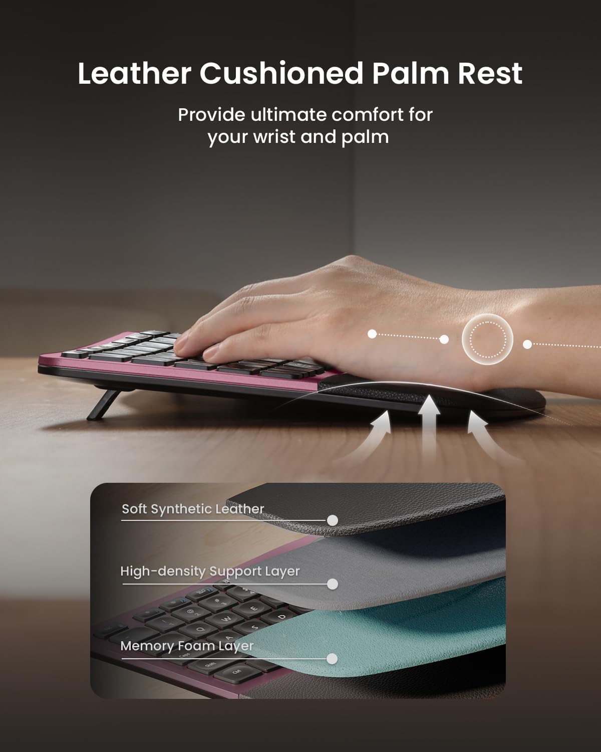 • Cushioned Wrist Rest: Curved wrist rest with soft memory foam layer offers typing comfort with more wrist support, less wrist bending compared to other standard keyboards without wrist rest. Adjustable tilt legs design positions the keyboard at a perfect angle to keep your wrist in a relaxed and comfortable typing posture whether seated or standing.