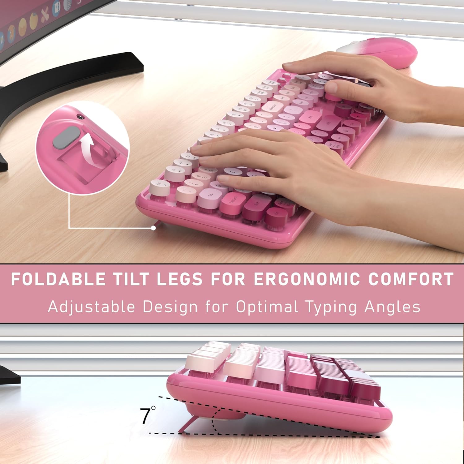 Wireless Keyboard and Mouse, Full-Size Retro Typewriter Keyboard with Round Keycaps, 2.4GHz for Windows, Mac, Laptop, PC, Desktop (Dark Pink Gradient)