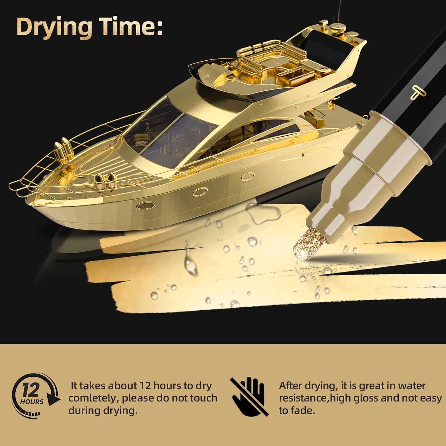• Versatile Application: These permanent gold marker pens is best used on smooth and non-absorbent surfaces such as metal, glass, rock, ceramic, plastic, gypsum, clay, jewelry, leather and more, the paint’s metallic finish adds brilliance to your creations, making it perfect for a variety of DIY projects. Perfect for detailing trim or coloring model cars, and add character to daily creations like illustrations, custom paintings, signature.