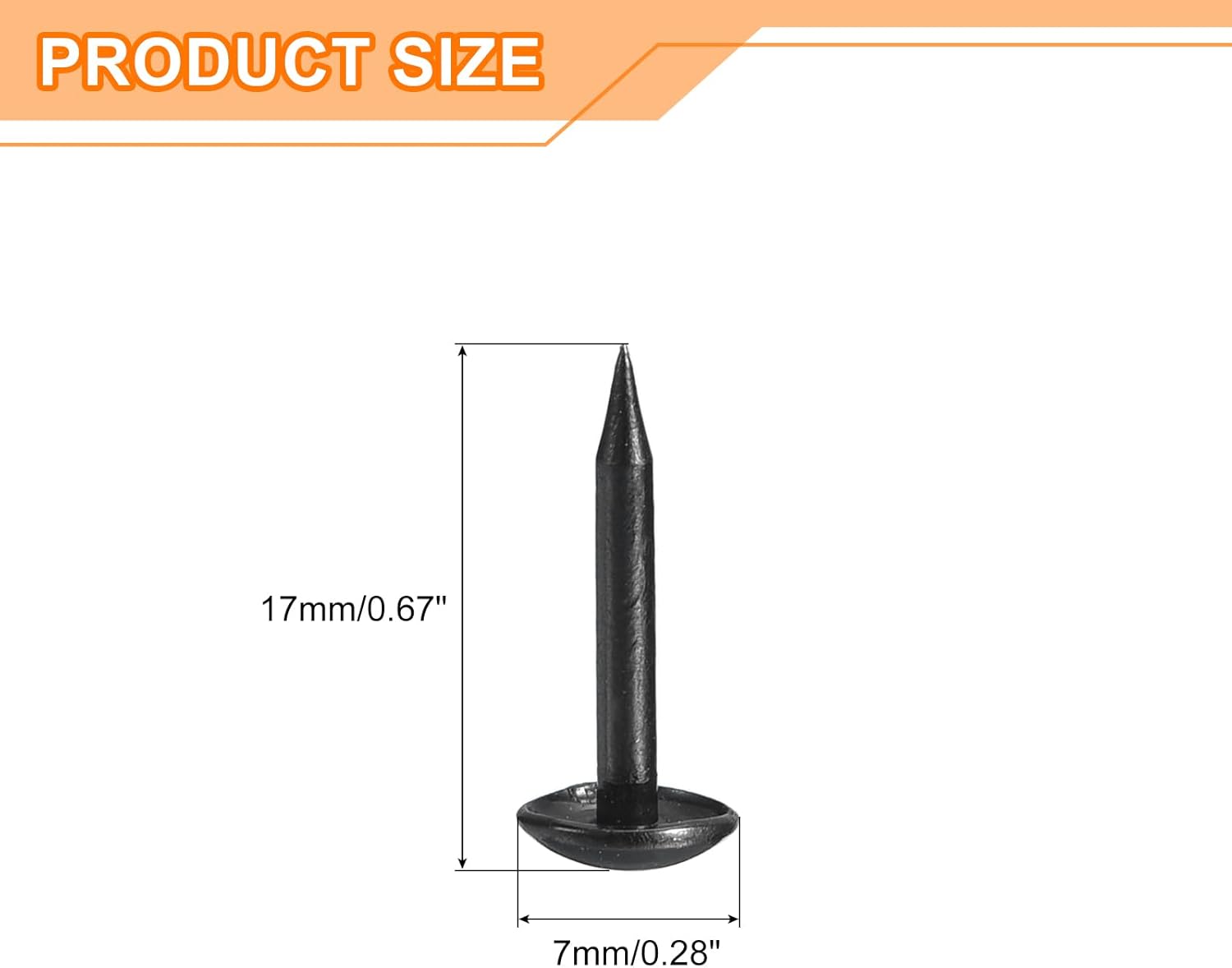 • Specifications: Material: Carbon steel; Color: Black; Diameter of nails head: 7mm/0.28inch; Shank length: 17mm/0.67inch; Package Content: 50Pcs x Upholstery Tacks Nail Pins
