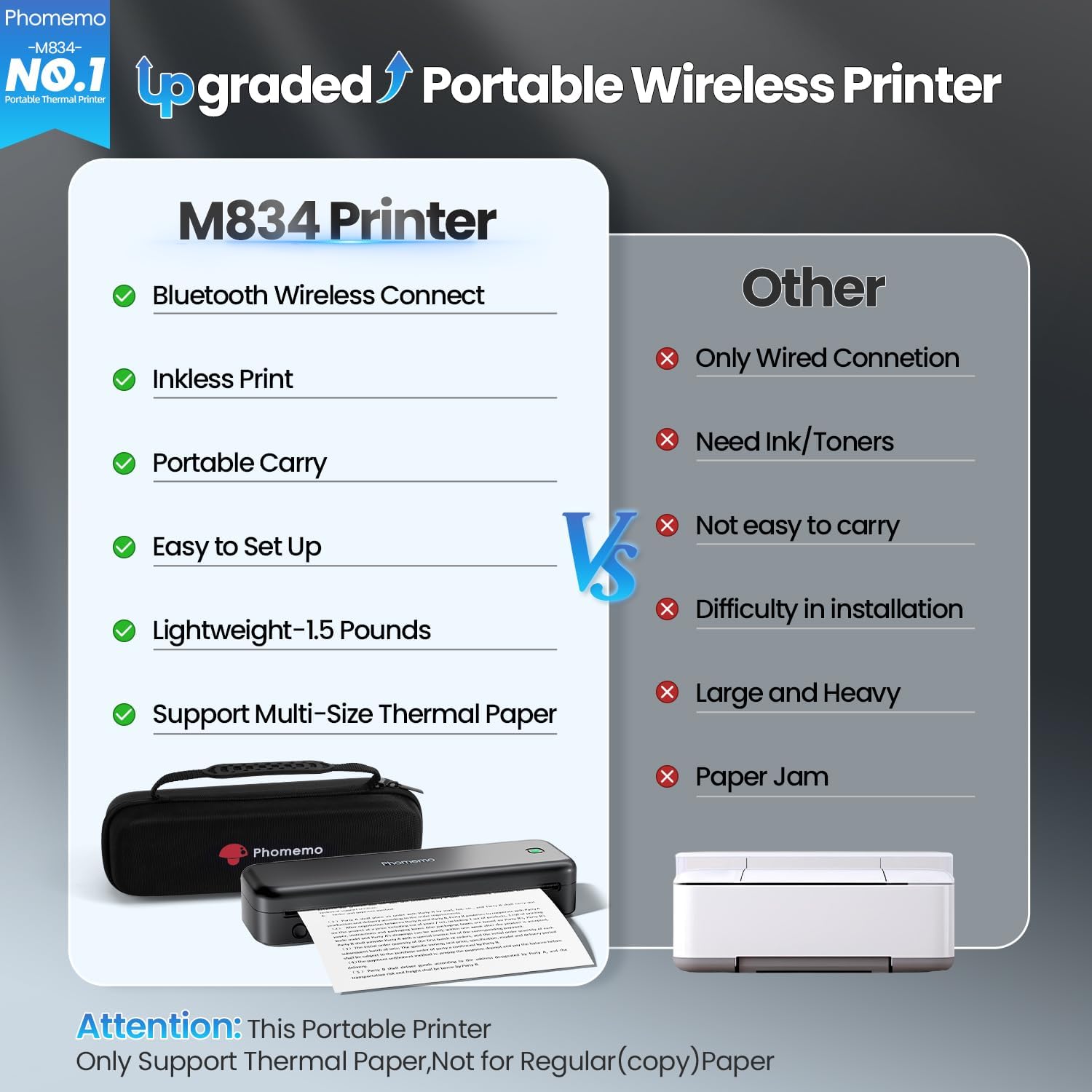 Phomemo Portable Printers Wireless for Travel Upgraded, M834 Bluetooth Thermal Printer 8.5" x 11"& A4 Size,Inkless Mobile Printer with Carry Case for Travel,Office,School,Car,Home,Black