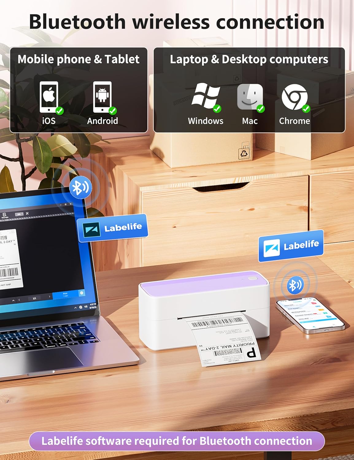 • [Print Via Bluetooth] - Phomemo bluetooth shipping label printer supports wireless printing through bluetooth connection. For IOS and Android mobile Phone, need to download the "labelife " APP from Apple Store or Google Play. With easy and simple operations, you can easily print your logo, labels, and more, making your life more convenient! Note: All devices cannot be directly connected to Bluetooth and need to be used through the app