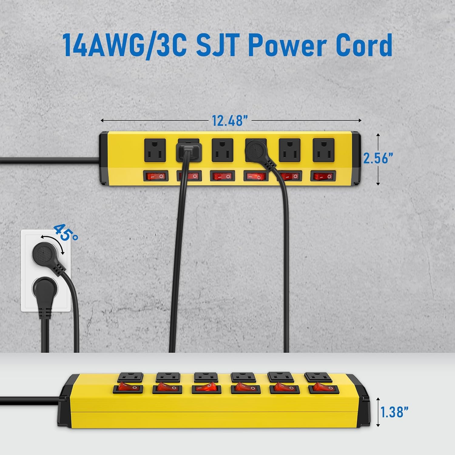 ANNQUAN 6 Outlet Metal Power Strip with 6 Individual Switches,Heavy Duty Power Strip 1200J 15A 25FT Cord Home Office Industrial Commercial Shop