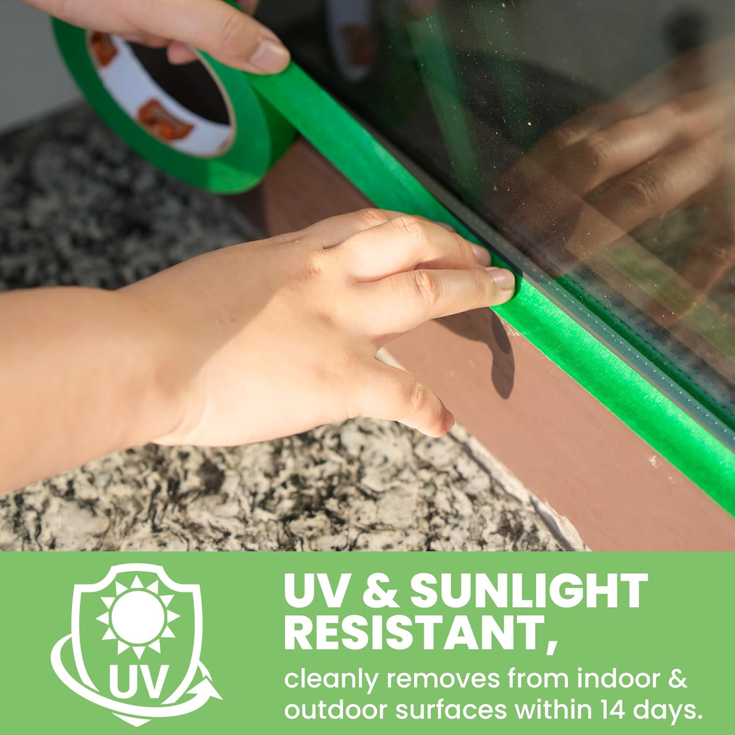 • INDOORS & OUTDOORS USE: Green Painting Tape resists UV rays, sunlight and moisture, so you can use it as an indoor or outdoor tape. It can be used on hot summer days and/or in direct sunlight. Easy to use, resists splintering, hand tearing and is writable.