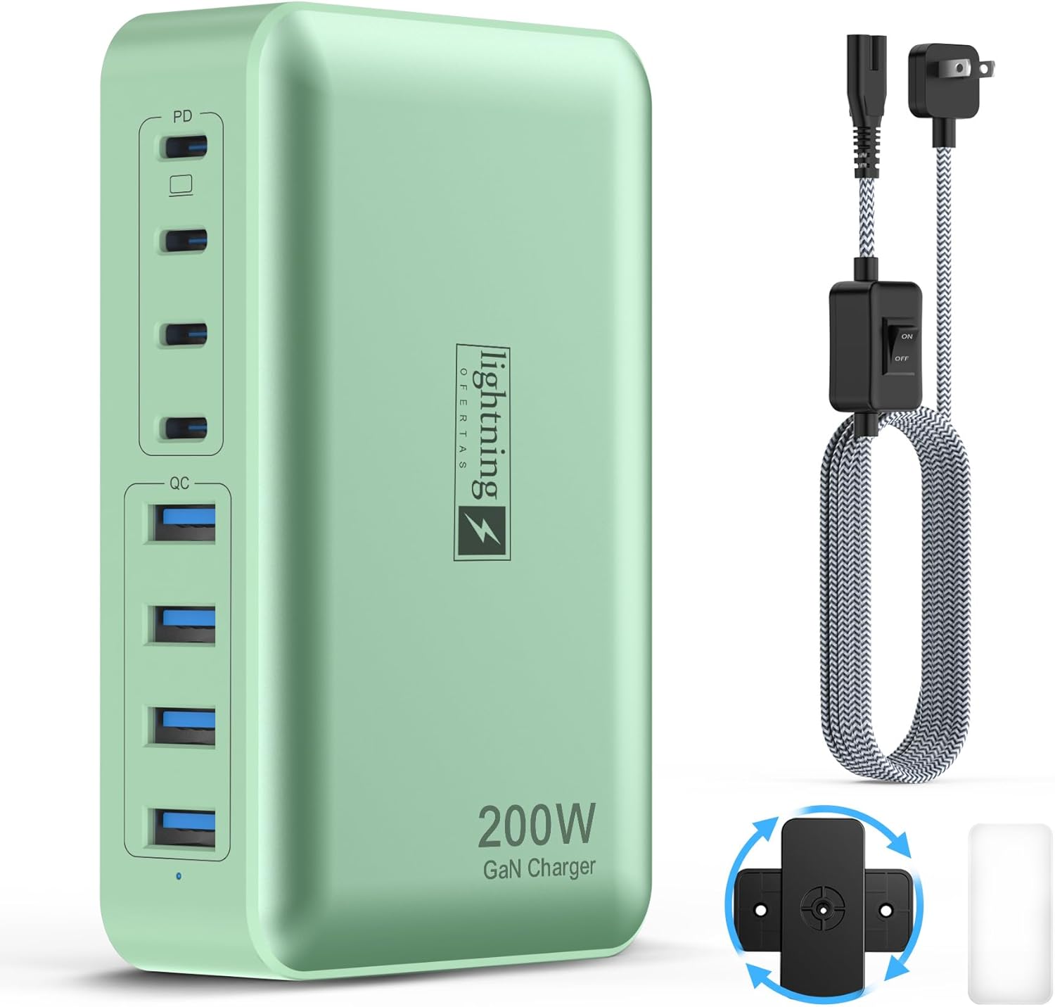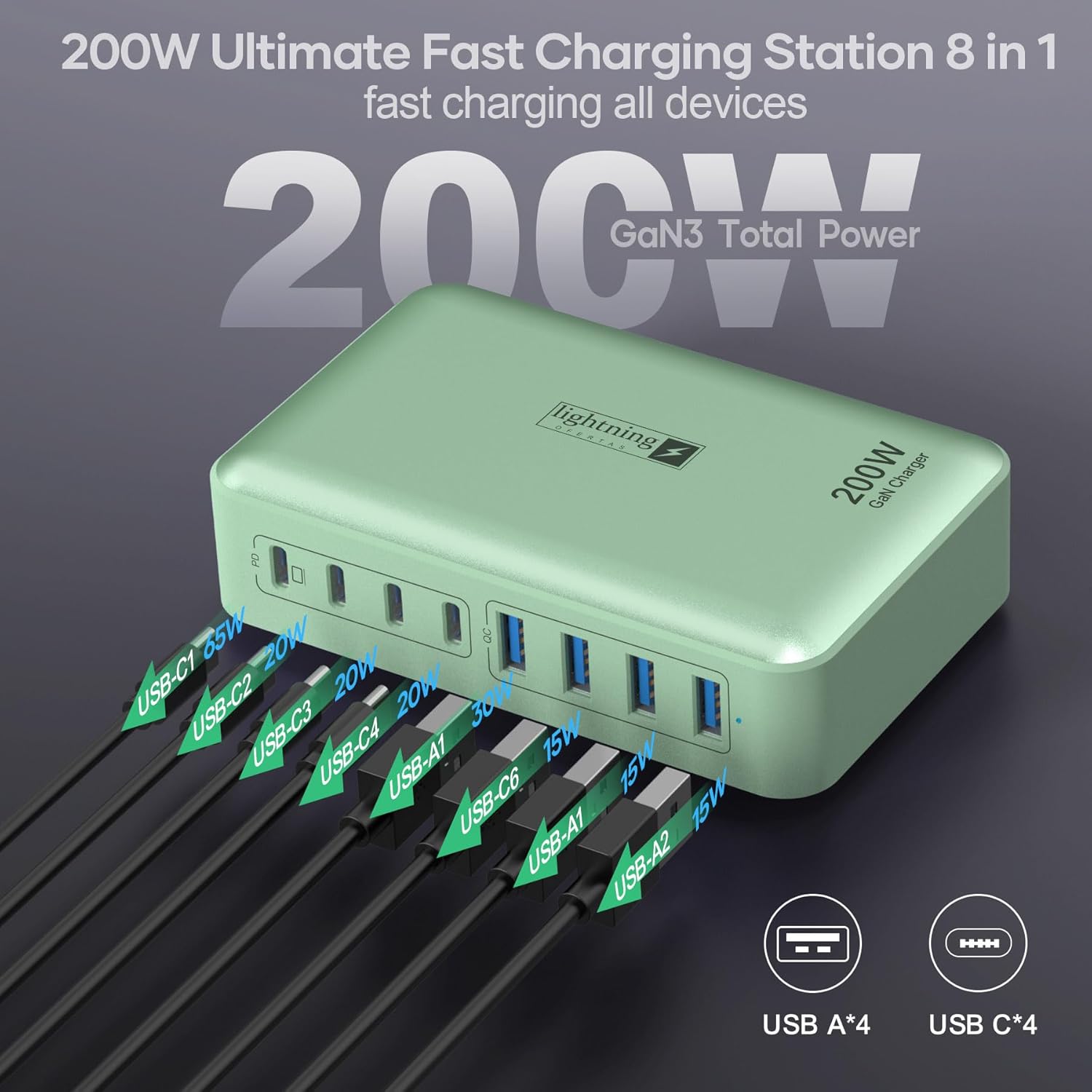 • Powerful 200W GAN charger with USB-C and USB ports, compatible with Apple, Samsung, and other devices.