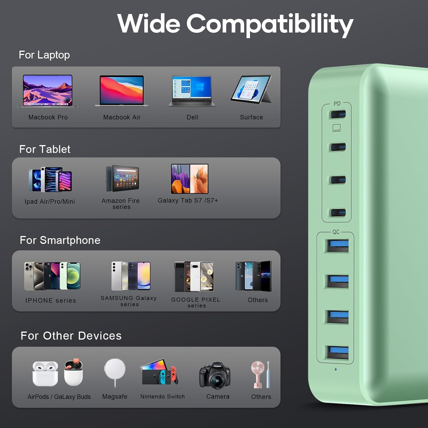 • Fast charging capabilities for laptops, MacBook, iPhone, iPad, and more, ensuring quick and efficient power delivery.