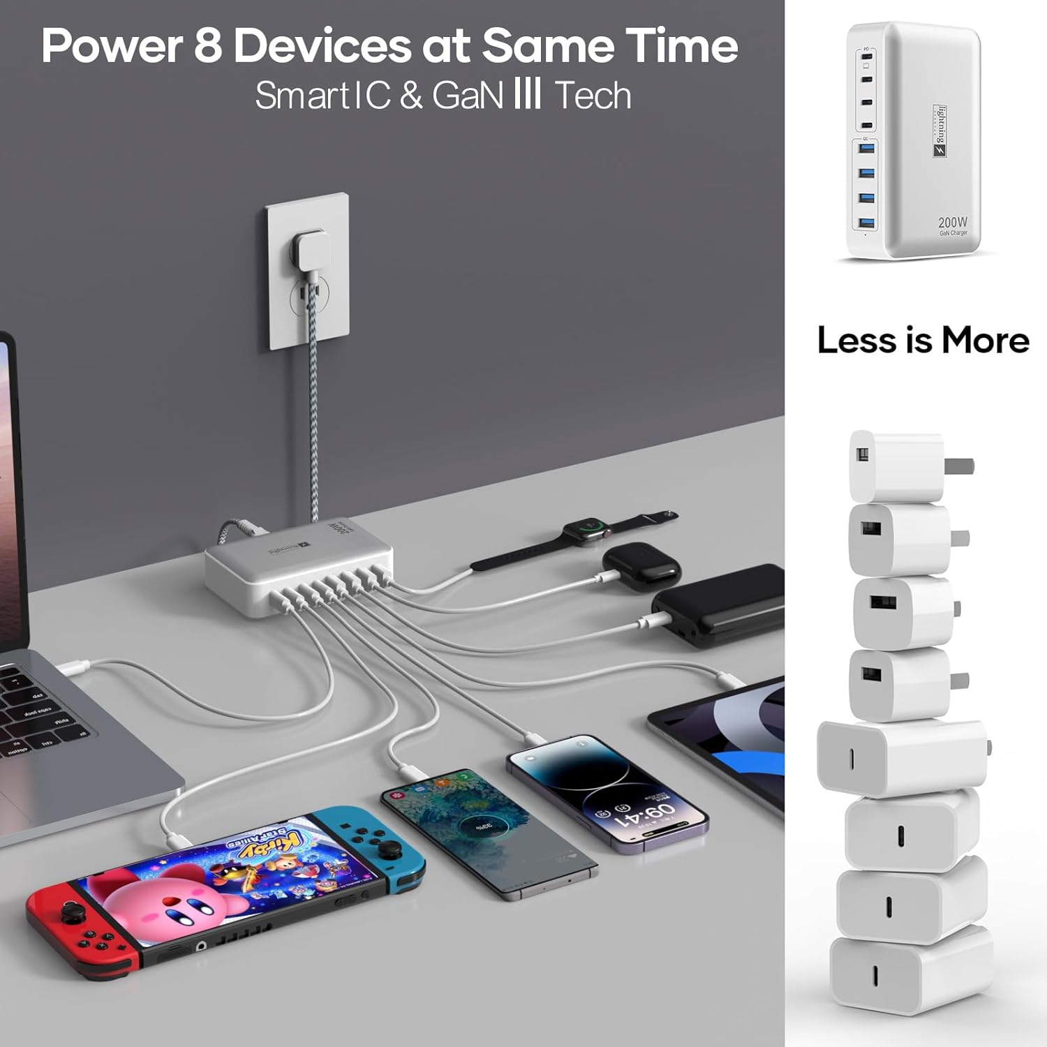 • Powerful Charging: This GAN charger features a total power output of 200W, with 4 Type C ports and 4 USB A ports, allowing you to charge multiple devices simultaneously.