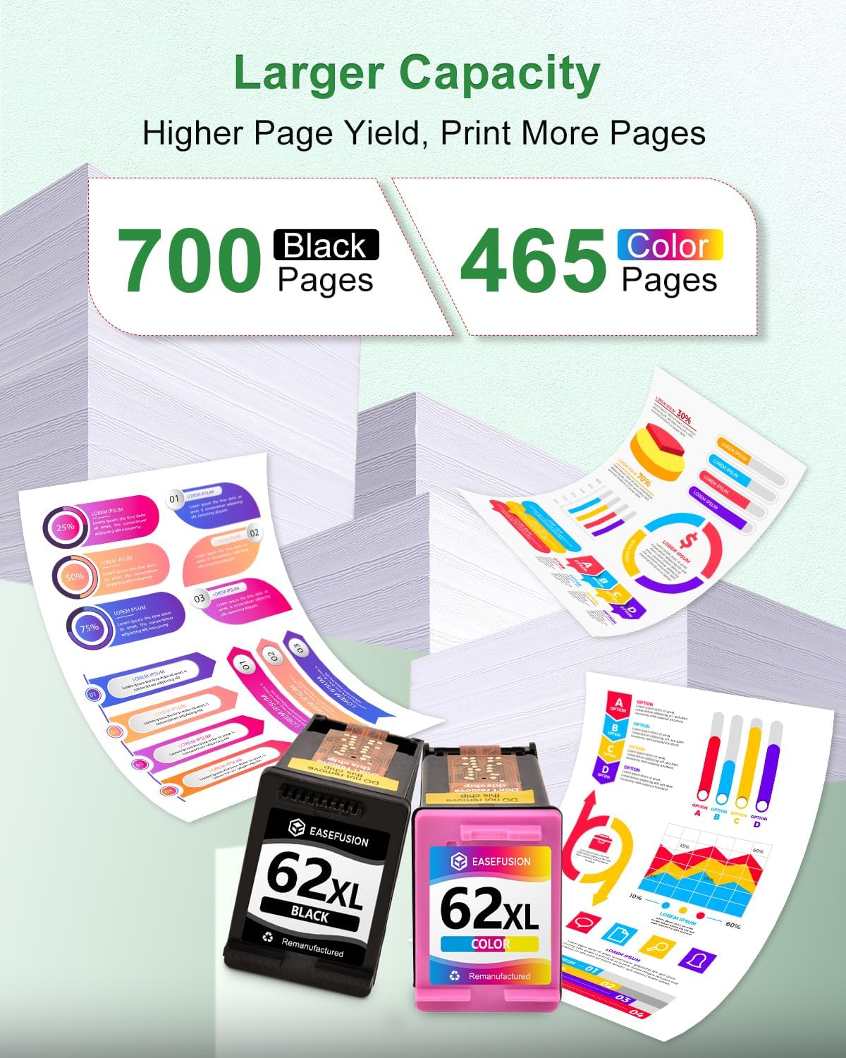 • Premium Ink Cartridges: EaseFusion 62xl ink cartridges black and color includes 62xl ink cartridges black x 1 and 62xl color ink cartridges x 1. Each remanufactured for hp 62xl ink cartridge combo pack is individually packaged to better protect the chip and print head from ink leakage, ensuring that you receive printer ink 62 in good condition and can start printing right away