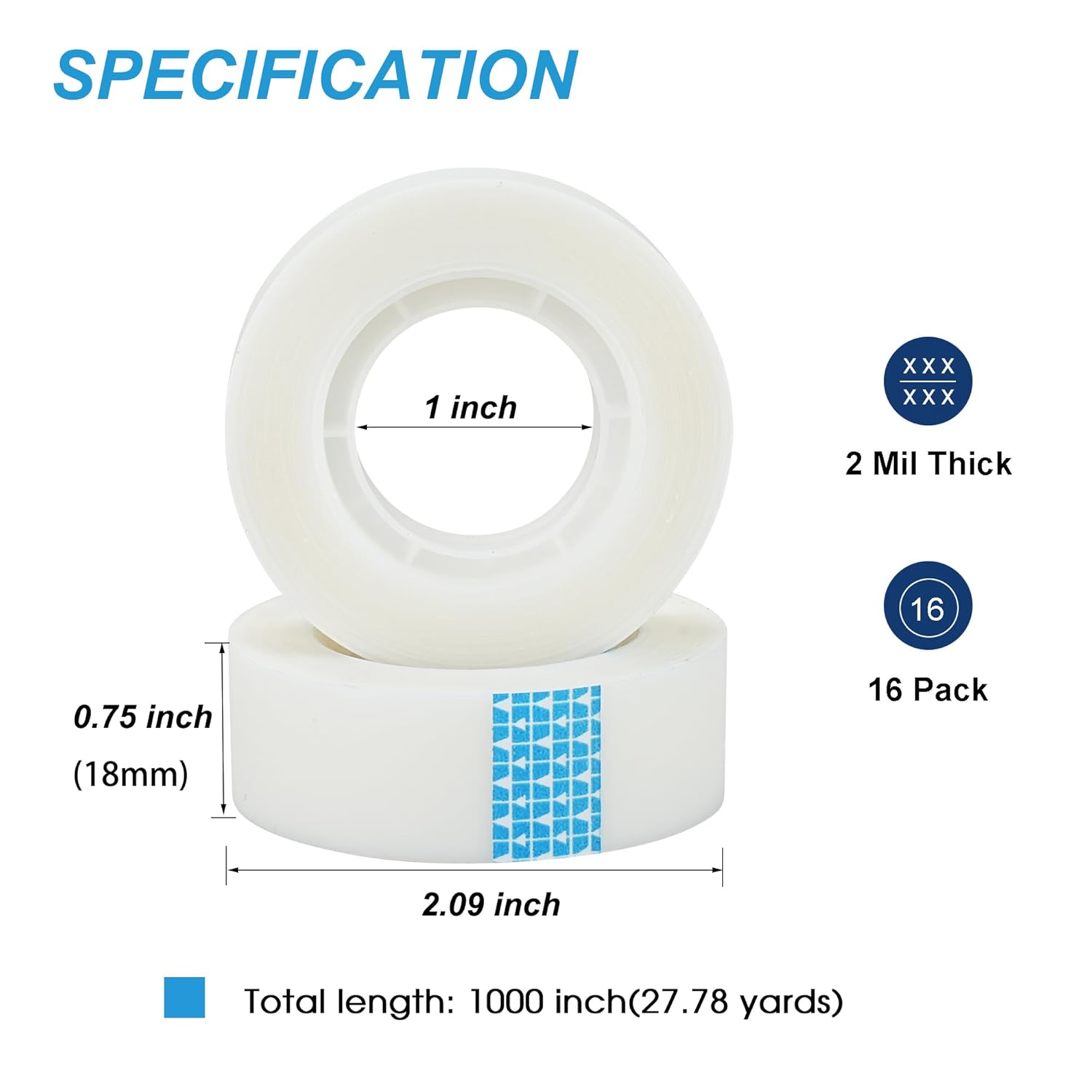 Tape Refills Bulk, 16 Rolls Invisible Tapes for Dispenser, 3/4 Inch X 1000 Inch, Writable Tape, Easy to Tear by Hand for Home School Office Supplies