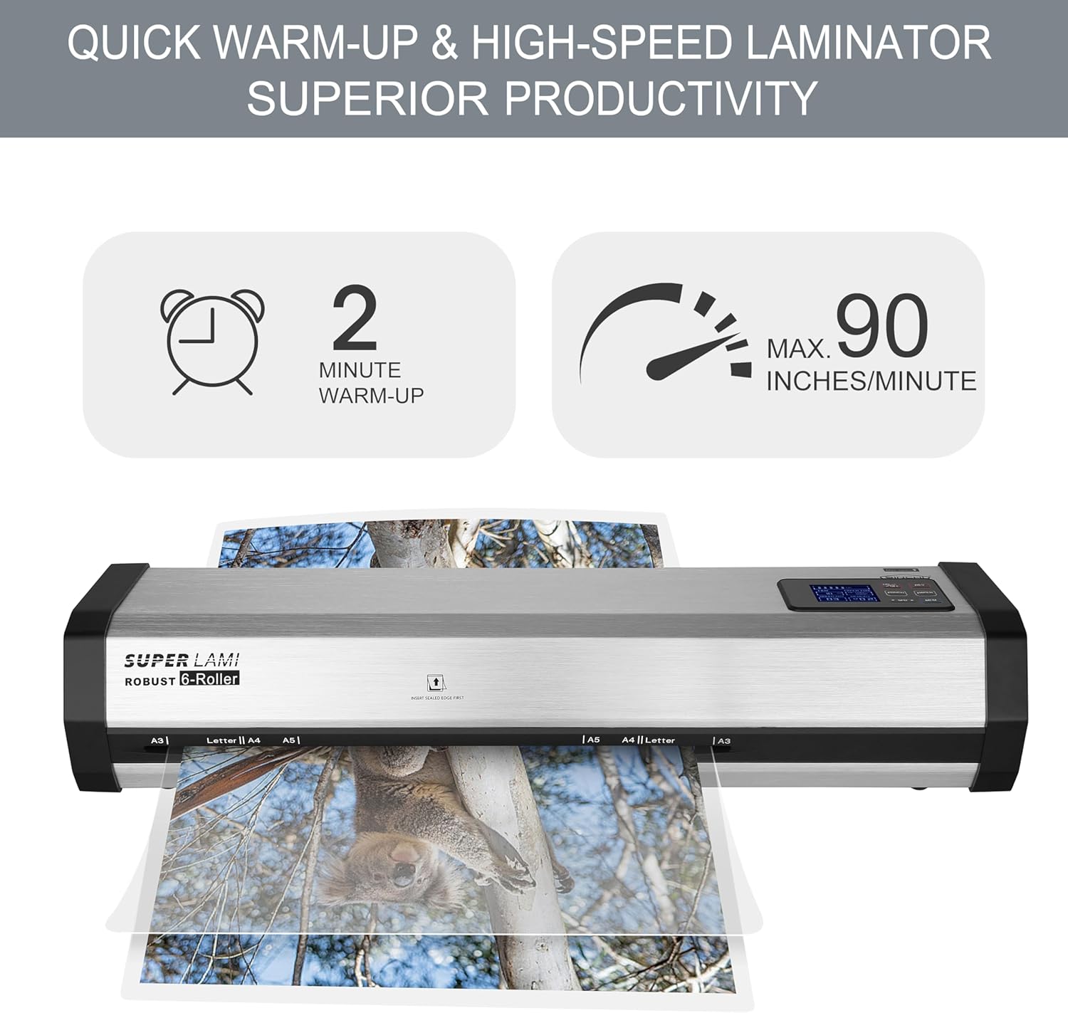 • 【Superior Productivity】The combination of 2-minute warm-up & maximum 90 inches/minute speed saves you valuable time on lamination projects. It takes only three minutes to laminate ten 3-mil letter-size pouches from turning on the machine.