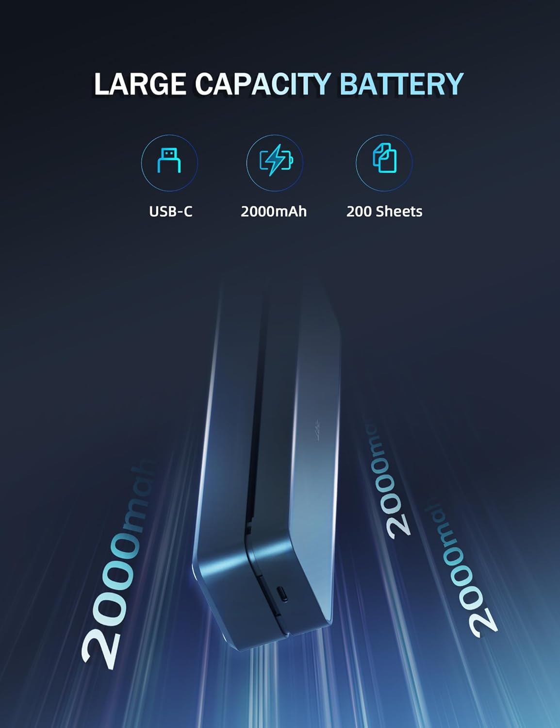 • DURABLE AND LONG-LASTING BATTERY: The travel printer comes with a built-in 2000mAh battery. Once fully charged, this battery can support up to 4 hours of continuous printing, enabling the printer to produce up to 360 sheets of paper. The 300 dpi printer is suitable for home, school, office and vehicles.