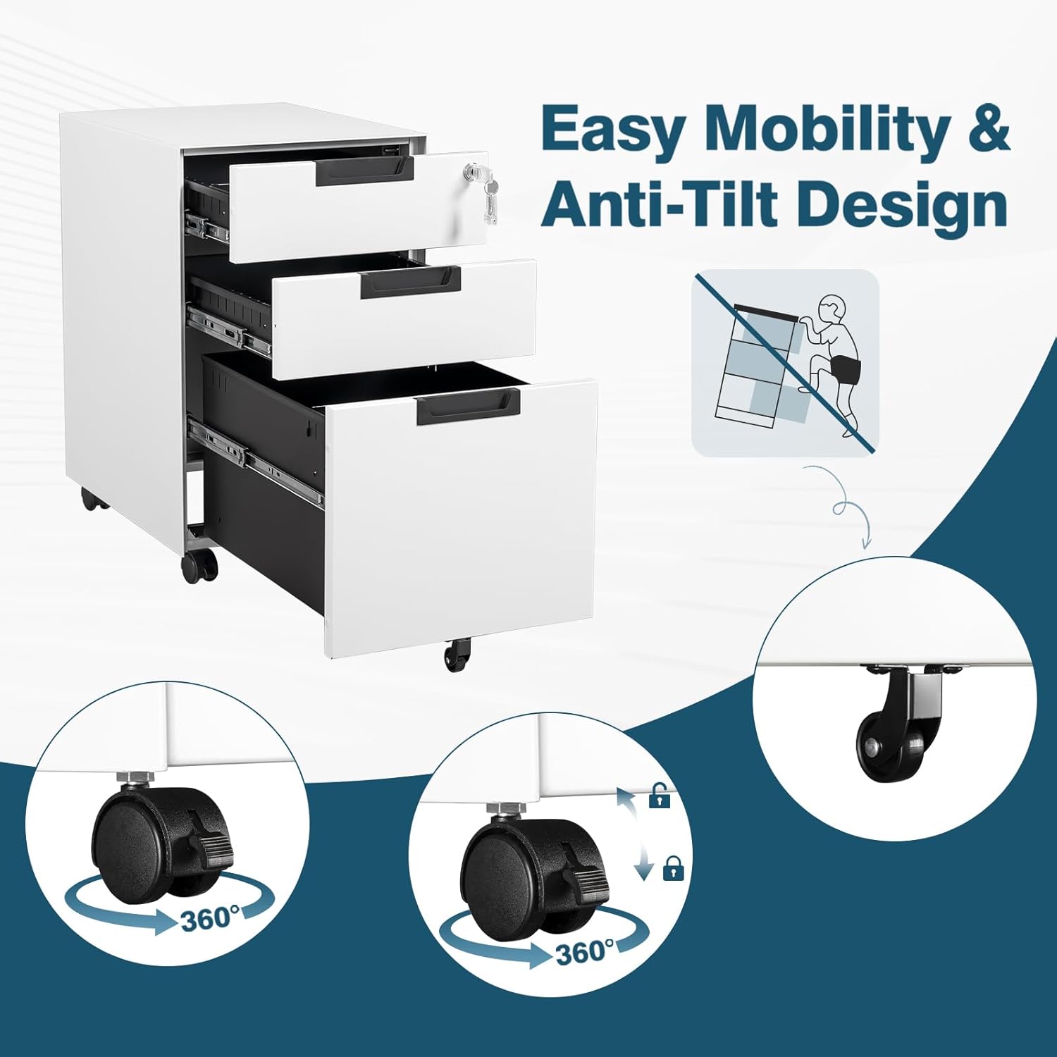 • 【File Cabinet with Lock】: A lock is set at the top of our file cabinet and is designed to lock all three drawers. This helps to keep your sensitive documents secure from prying eyes. You are provided with two keys for the lock.
