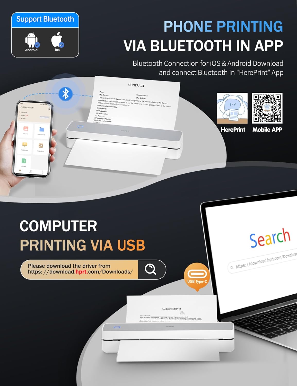 • Easy to Use: The portable thermal printer supports Bluetooth (mobile phone APP) and USB (PC) connections. Connect via Bluetooth on your phone: (1) Download the "HerePrint" application from the App Store. (2) Turn on the inkless portable printer. (3) Turn on the mobile phone Bluetooth and add the MT610 Pro in the application to establish a Bluetooth connection. For USB-C connection on the PC, you need to follow the steps in the manual to install the driver.