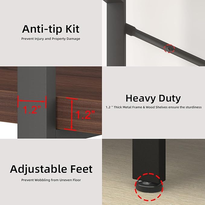 • 【Crossbar and Adjustable Feet】: The design includes a crossbar for additional stability, along with adjustable feet to ensure the wood and metal book shelf remains steady on uneven floors, preventing any wobbling or tilting.