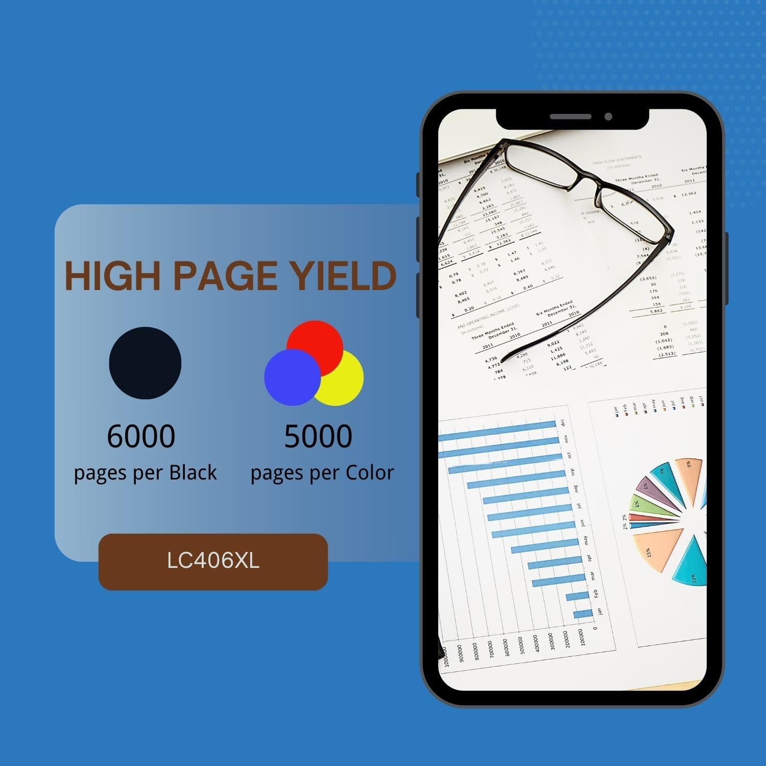 • Page Yield: UP to 6,000 pages per LC406XL LC 406XL Black Ink Cartridge (LC406XLBK) and 5,000 pages for LC406XL LC 406 XL Color Ink Cartridge LC406XLC LC406XLM LC406XLY High Yield Ink Cartridge (A4 Letter, at 5% Coverage)