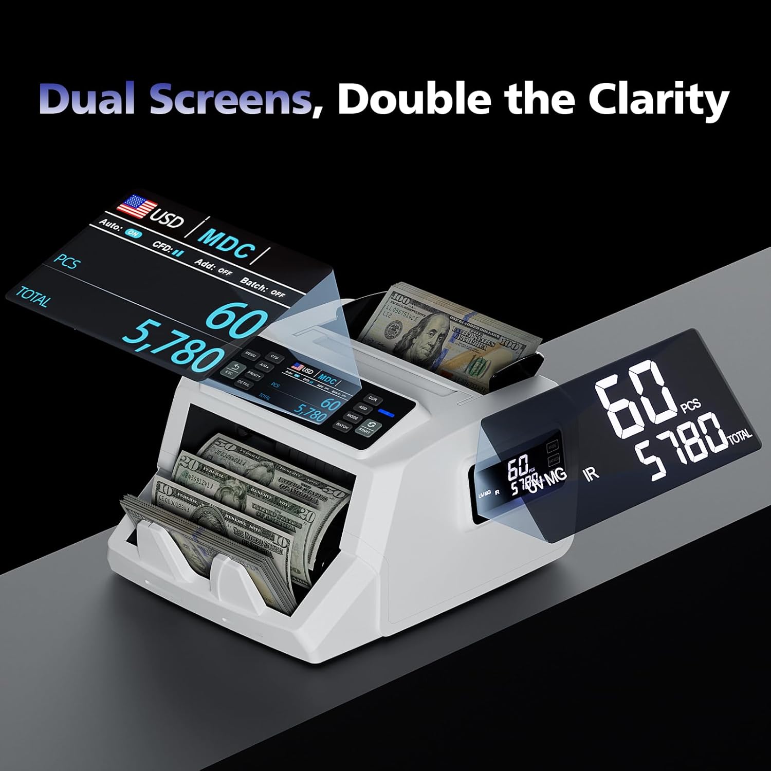 • 【Dual-Screen Display】This money counting machine is equipped with a 3.5" TFT main display and a unique side screen, enabling clear visibility of counting data from multiple angles. The dual-screen setup enhances both operator convenience and customer interaction.