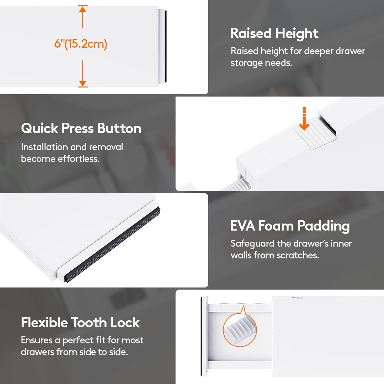 • Sturdy Construction: Made of robust ABS material, our dresser organizer features EVA foam sponges on the ends to prevent scratches and damage to your drawer’s interior, ensuring a clean and stable fit without residue; Our divider is patented (Patent No: US12133593B2)