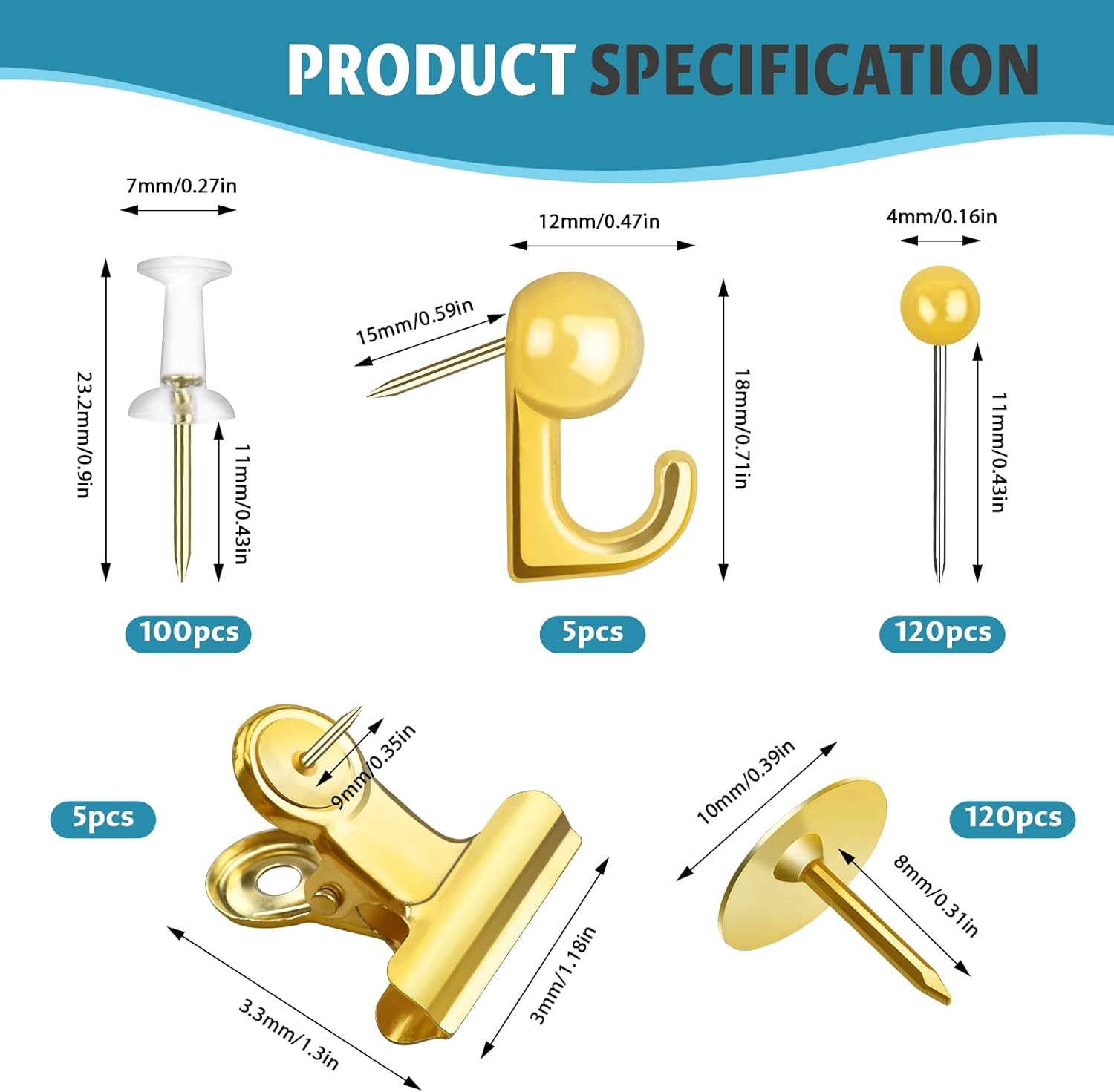 • Package Includes: 350pcs push pins in 5 types, 100pcs clear push pins, 5pcs gold push pin hooks, 120pcs gold map tacks, 5pcs gold push pins clips, 120pcs gold roundness thumb tacks. Each style is placed in a separate compartment for your convenience
