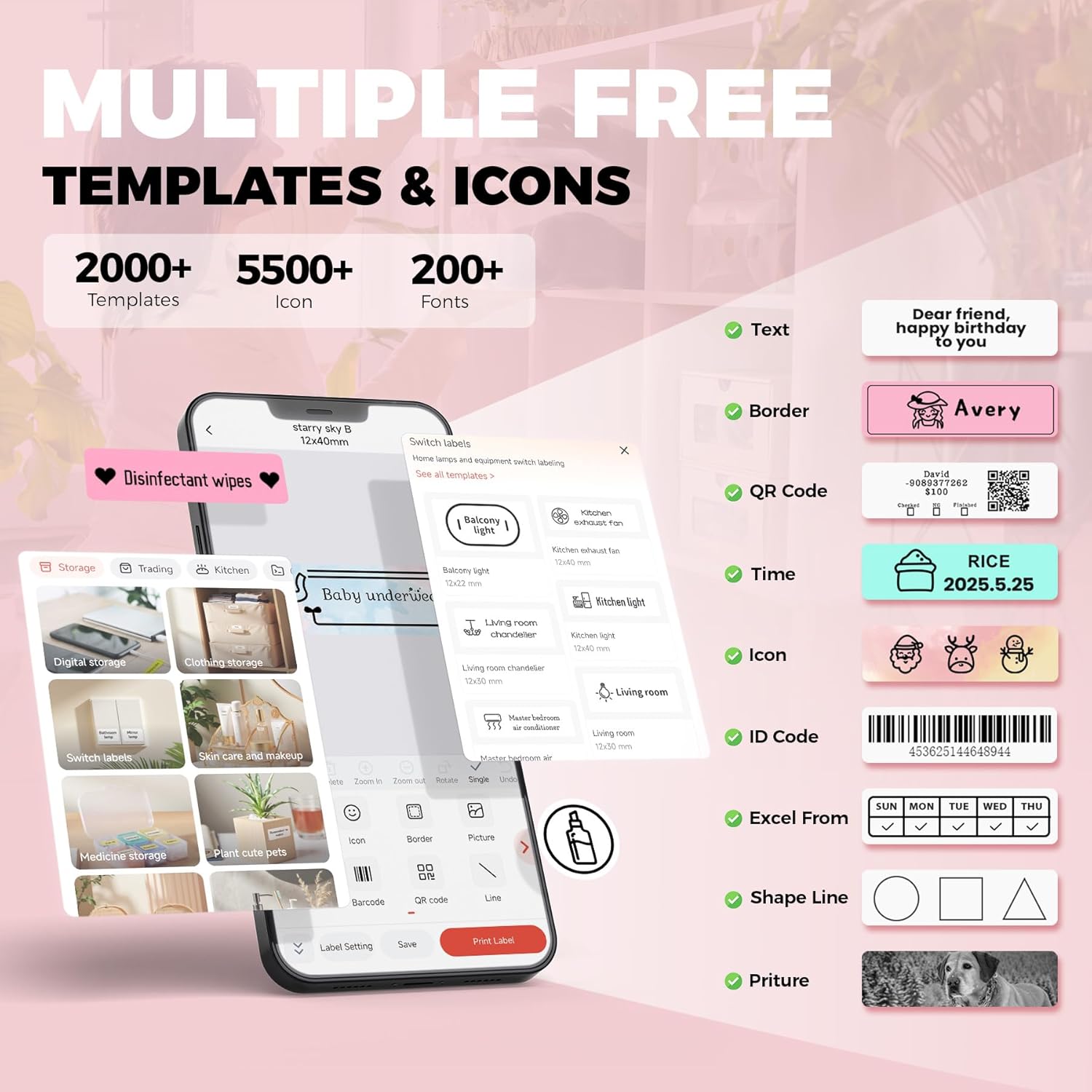 • Feature-Rich and Template-Diverse: Print Master APP provides over 15 languages, 115 fonts and 650 materials, making it easy to customize labels. And it supports printing various texts, numbers, graphics, symbols, logos, barcodes, QR codes, etc. The portable label maker can meet all your note needs