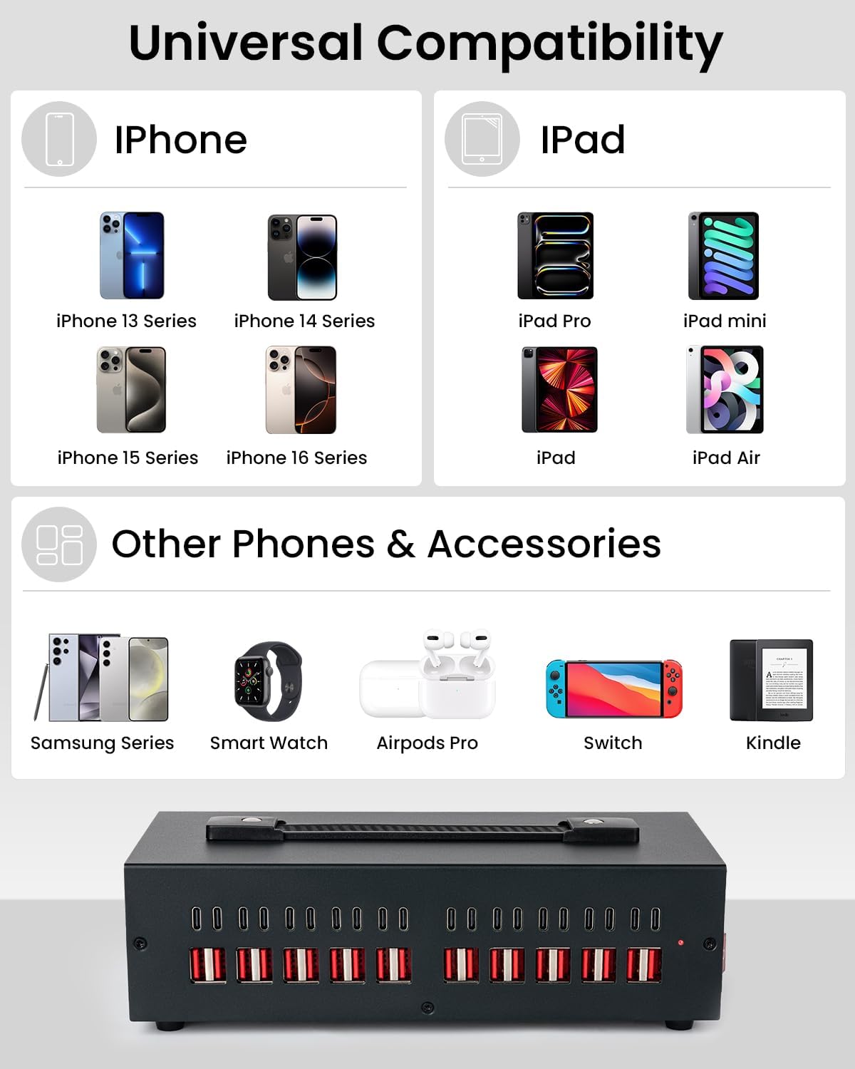 • 40-Port USB~C Charging Station: This USB~C fast charging multi-port charger features 20 USB~C ports and 20 USB A ports, supporting a total output of up to 300W. Multiple usb charger station effortlessly powers up to 40 devices simultaneously, with each port delivering a maximum output of 3A. Perfect for home, office, and travel.