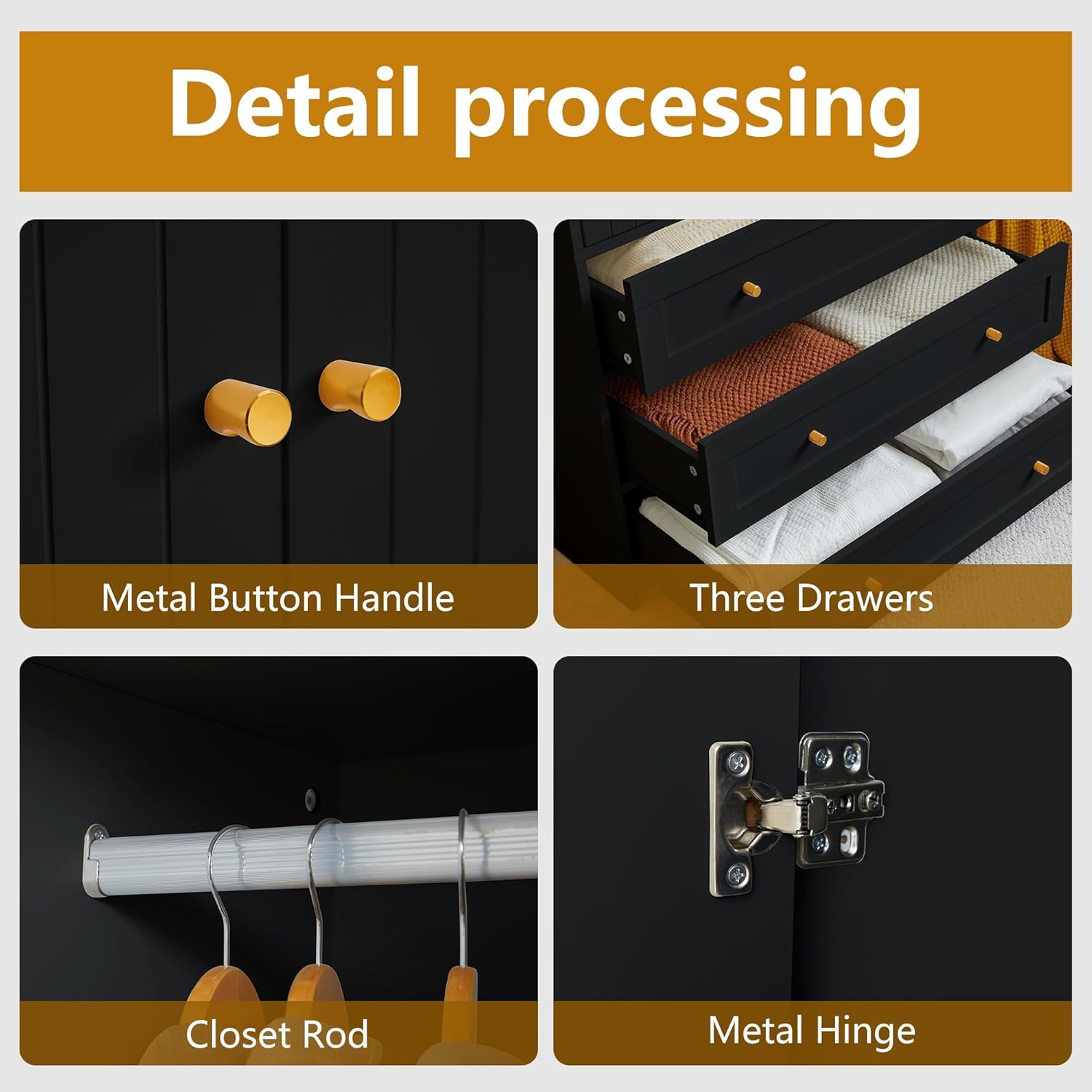 • 【Elegant Style】This wooden wardrobe is simple, it combines black panels with gold handles to create luxury charm.This large wardrobe matches well with various house decors.