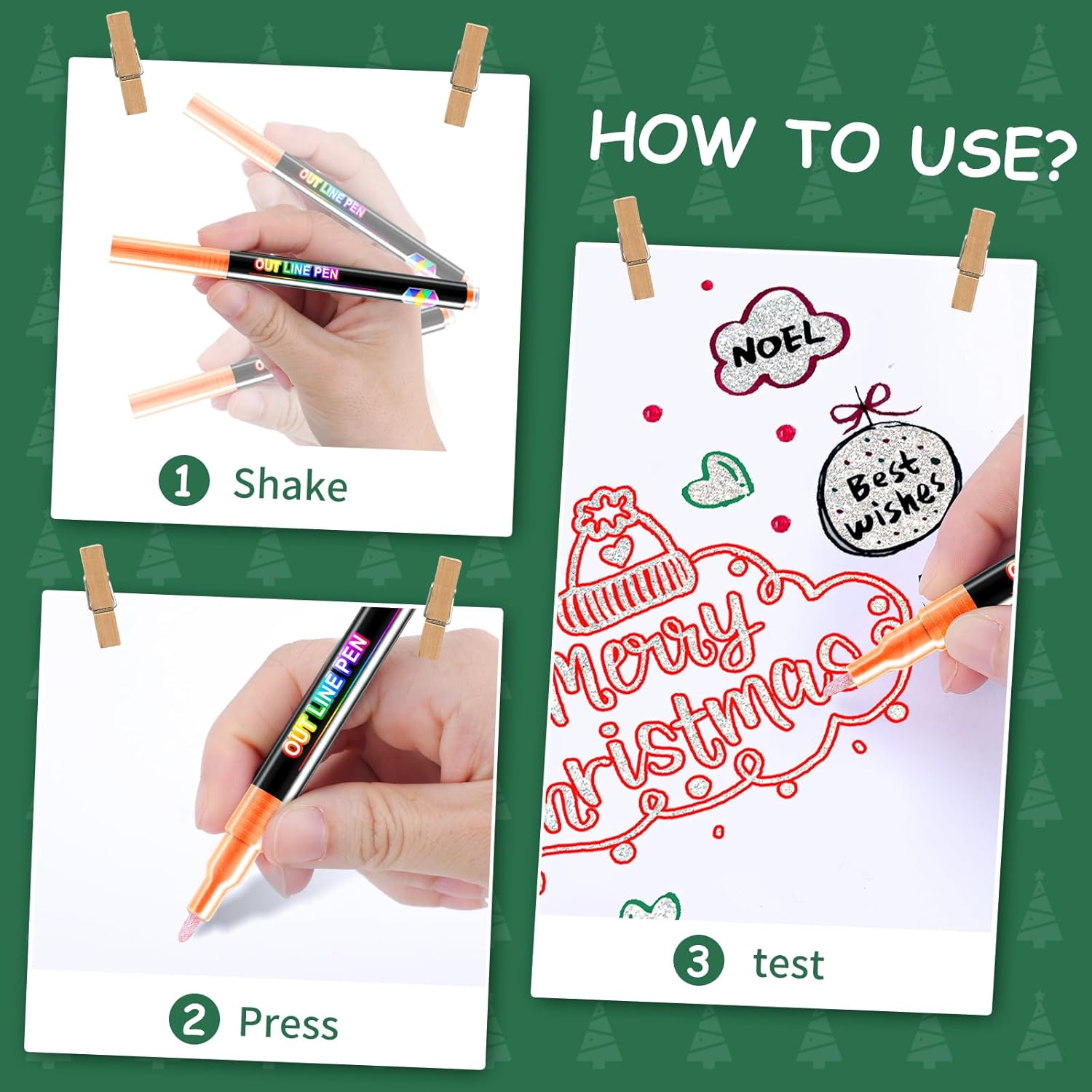 FUMILE 12 Colors Double Line Outline Markers,Glitter Markers for Kid Teens,Self Outline Metallic Markers for Art Supplies,Metallic Glitter Pen Set for Teen Girl.