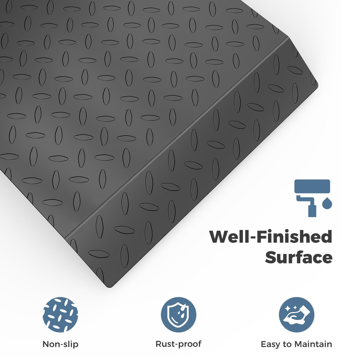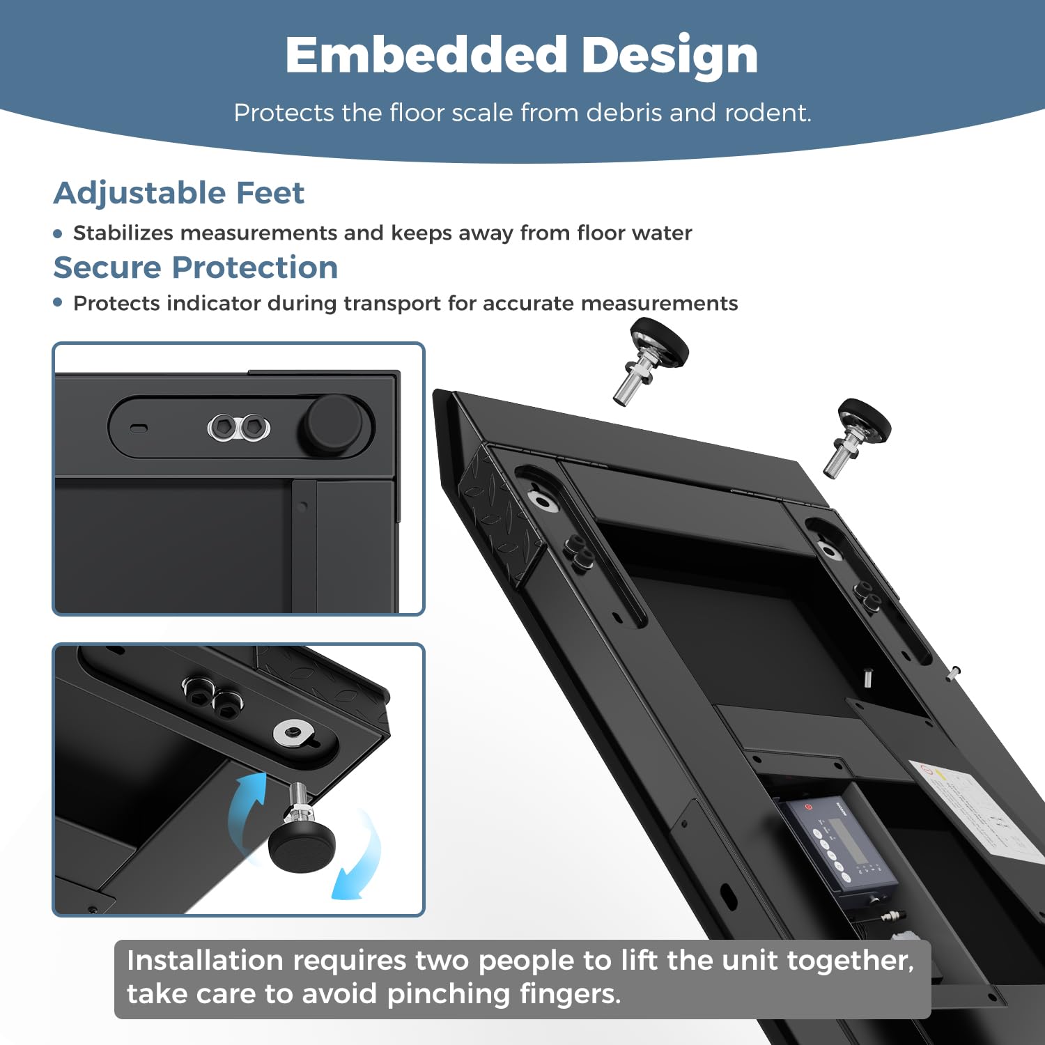 • 56.3" x 20" Carbon Steel Platform: This robust floor scale features a channel steel frame for exceptional stability. The diamond plate surface ensures that animals remain steady during weighing, while the well finish protects scale from dust and rust. The scale is equipped with four adjustable non-slip feet, allowing for easy calibration to accommodate various floor conditions. Additionally, the embedded weighing sensors are designed to keep from debris and rodents.