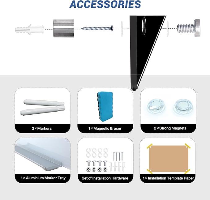 • Setting up your new glass whiteboard is a breeze with our straightforward installation process. Mounting hardware is included, allowing you to quickly and securely affix the board to any wall.