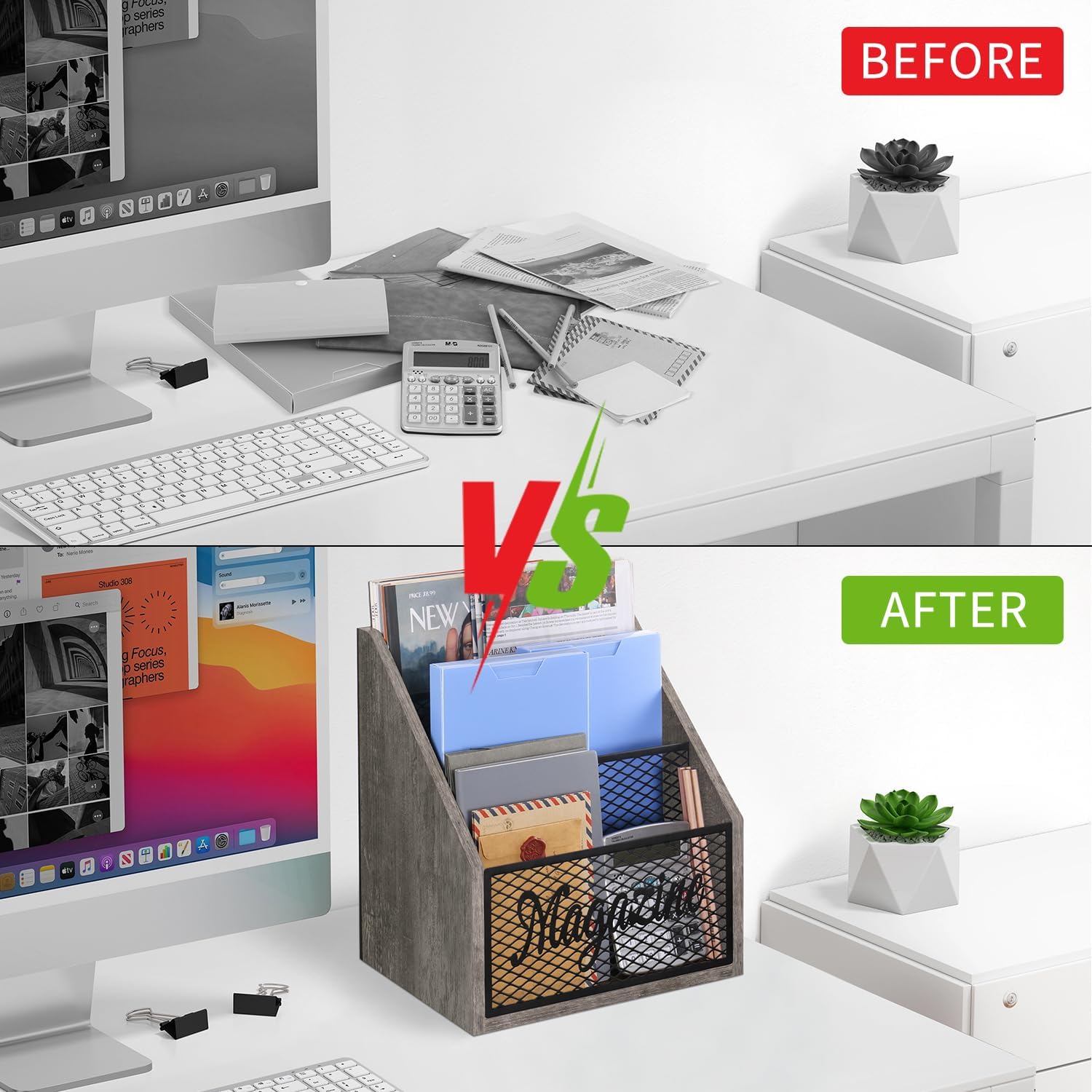 • Unique Sloped Design:Unlike other magazine holders,the magazine rack boasts a special design with three stepped sloped compartments, an exclusive creation by our designers. Different lengths of files can be placed in varying depth compartments,effectively organizing mail,bills,magazines,and office documents.