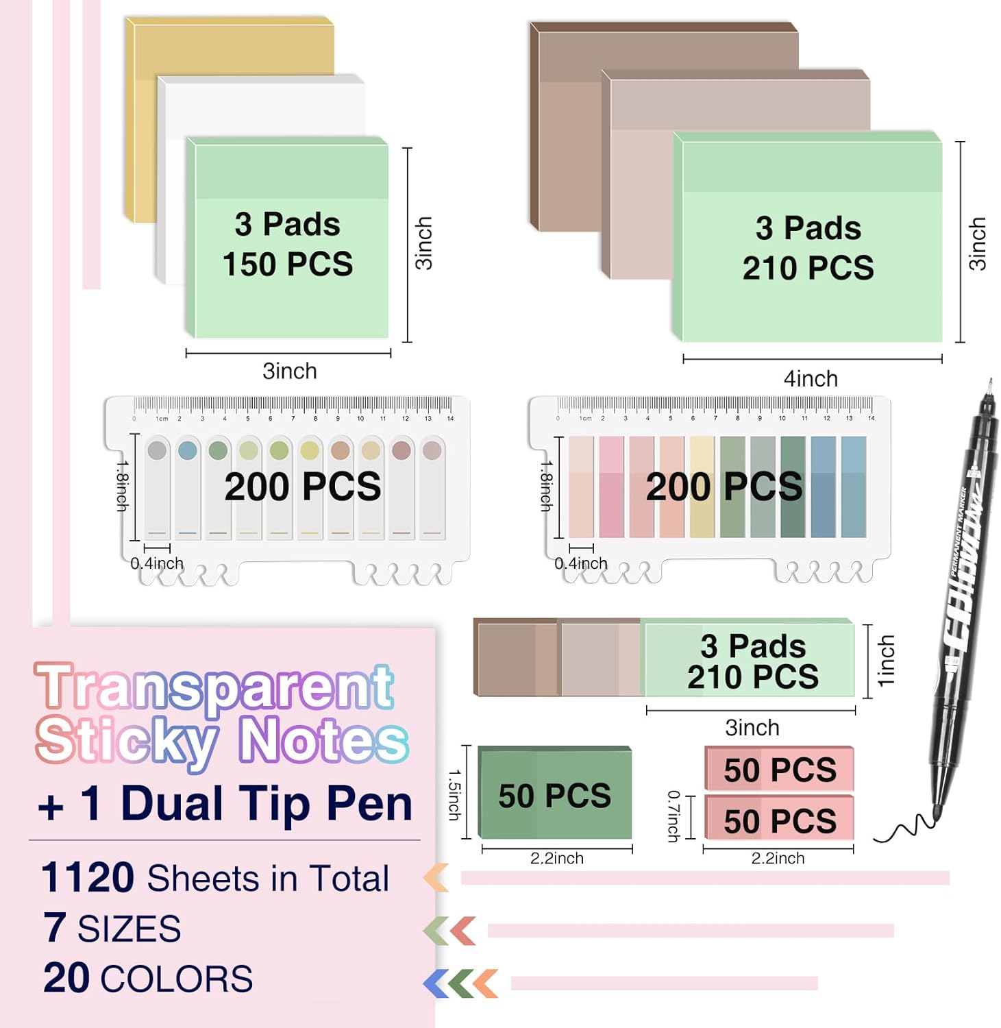 • 【Transparent Sticky Notes】Transparent sticky notes set offers great value with 4 shapes, 8 sizes, 20 colors, and 1120 sheets in pastel colors, enough supplies for a long time. Clear sticky notes meet your various note-taking needs.